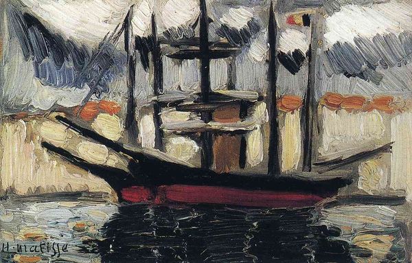 Curator: Let's consider this striking oil painting by Egon Schiele, dating back to 1908. Titled "Sailing Boat with Reflection in the Water," it offers us a glimpse into his early expressionist explorations. Editor: It’s brooding. Even with those ochre sails, the heavy blues and blacks of the hull and its reflection give the work a sense of something weighty and immobile. It is vibrating but static, how about that? Curator: Yes, and remember Schiele was deeply engaged with the sociopolitical context of Vienna at this time, and he’s using this harbor scene, I think, to communicate something of his state of mind, as the harbor city feels caught between tradition and modern anxieties. What do you make of the impasto? Editor: Oh, that's where it gets exciting. Look how the paint is applied – thick, almost sculptural in places. You can practically feel Schiele wrestling with the materiality of the oil, building up the surface to capture not just the image of a boat, but also the raw energy of his perception, very hands on, and artisanal work that almost reminds me of the act of building and then mirroring its essence into the water. Curator: That's insightful, that brings us back to materiality! There's a certain vulnerability communicated in Schiele’s early expressionistic approach and I think in particular we need to ask ourselves how does it question tradition through such heavy materiality. Editor: Absolutely. The reflection is particularly captivating. Instead of a precise mirror image, we see distorted, swirling lines, revealing the tension between surface appearance and underlying realities. He also challenges traditional craft through expression as well! Curator: It invites us to consider the psychological undercurrents present in everyday scenes during a period of dramatic cultural change and challenges what's going to last in the city life, while focusing on labor and consumerism during these industrial times. Editor: I agree. It's as if Schiele is suggesting that even the most familiar objects—like a sailboat in a harbor—can be imbued with profound emotional and social significance through process. Curator: And as such the image of a sailboat becomes as multifaceted as labor, economy and the state of a nation going through hard times. Editor: And perhaps even a quiet meditation of the reflection that we must embrace during dark times!