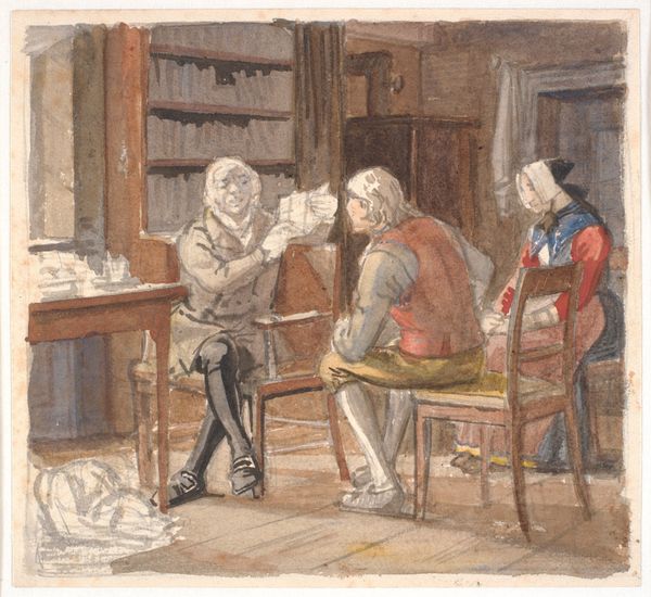 Hendrik Albert van Trigt made this watercolor, "Vondel in zijn laatste levensjaren," sometime in the 19th century. The subdued and translucent quality of the paint lends a melancholic air to the scene. Van Trigt applied thin washes of pigment to build up the composition. You can see the texture of the paper showing through, creating a subtle contrast with the smooth, almost polished surfaces of the furniture. Watercolors were a popular choice for artists aiming to capture intimate, domestic scenes because they were relatively inexpensive and portable. But don't let the informality fool you; the choice of watercolor was significant. The subtle gradations and soft edges give the scene a sense of quiet contemplation. The medium invites us to consider the weight of Vondel's years and the emotional atmosphere of the room. Ultimately, the watercolor's delicate nature underscores the fragility of life and memory.