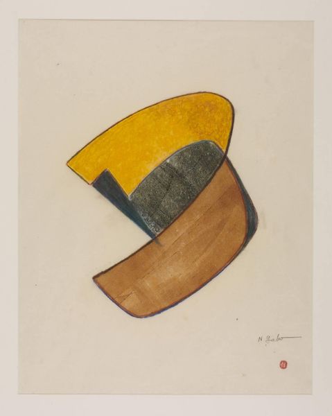 Curator: This mixed-media piece is an "Untitled" work from 1996 by Hassan Massoudy. The composition seems to immediately convey a strong sense of monumentality, despite the relatively modest scale suggested by the details in the rendering. What's your initial impression? Editor: My gut reaction? A slightly unnerving yet elegant glyph. It reminds me of an ancient sentinel rendered in ochre and umber. Is it meant to evoke the head? It's strangely compelling, that flash of red, the peek of yellow amidst these weighty shapes, is almost like a coded face. Curator: Indeed, there appears to be a suggestion of figuration. Notice how Massoudy masterfully abstracts from both form and script. The calligraphic line, inherently imbued with cultural meaning, transcends literal legibility, instead pushing towards pure form and dynamic movement. The interplay of flat planes and delicate brushstrokes generates an aesthetic tension, doesn't it? Editor: Absolutely, it teases the eye! It's like he's asking us, "What do you see?". Is it a head? A landscape? An idea struggling to manifest? Also, I find myself quite drawn to the deliberate choice to let these strokes spill over the shapes. It breaks the clean lines and formal nature of this writing, breathing this wonderful quality of life into the picture. Curator: Precisely. Consider too the subtle semiotic game being played. Islamic art has long favored calligraphy not only as a decorative form, but as a vehicle for sacred expression. Massoudy honors this heritage even as he boldly embraces Modernist principles of abstraction. He manages to balance respect for tradition with innovative formal experimentation, which really does carry so much meaning. Editor: Exactly, that is where the magic lies—existing right on that cusp. A nod to heritage while still whispering something totally new. Its almost playful! Makes me want to decode more of these layered gestures. A second glance truly reveals new angles that beckon—how cool is that? Curator: I agree. The dynamism inherent to the piece invites us to repeatedly examine its components—line, color, form, text—allowing us, with each subsequent viewing, deeper insight into not just what this work *is*, but perhaps more importantly, what this work *does*. Editor: Well said. I must say, its boldness almost demands you to pause and unravel the dance between form and formlessness—it’s quite a meditative little gem!
