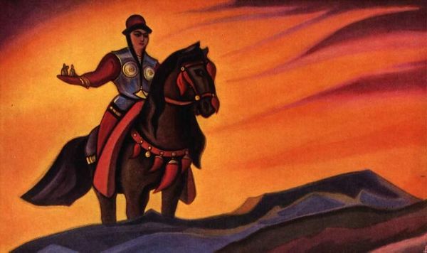 Nicholas Roerich made this painting of King Gesar with what looks like tempera on canvas, although I can’t be sure. What I love about this painting is the way it embraces the drama of a limited palette. It’s like Roerich set himself a challenge to evoke a whole world with essentially just one color: red. It’s not just red, of course, but a whole family of reds, from the fiery background to the more muted tones in the foreground. The texture isn't particularly heavy, but you can see the strokes, especially in the way the red is layered to create a sense of depth. Look at the way the figure of the king and his horse are silhouetted against that burning red sky. It’s a really bold choice, and it makes the whole scene feel both epic and intimate. Roerich’s work reminds me a bit of Marsden Hartley's, especially in the way they both use color to convey emotion and spiritual depth. Art is always in conversation, after all.