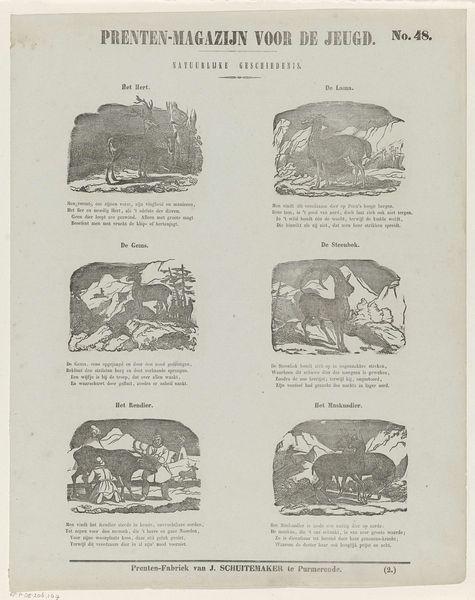 Curator: This engaging print, titled "Dieren," was created in 1843 by Jan Schuitemaker. It’s an engraving on paper, a real peek into the natural world as seen through a 19th-century lens. Editor: My initial impression is one of whimsical charm. It has a storybook feel, with its tiny scenes of animals in miniature landscapes, almost like sketches from someone's private sketchbook. Curator: Exactly. Schuitemaker was publishing this magazine specifically "voor de Jeugd", or for the youth, a sort of visual compendium of natural history designed to be educational, so there's a commercial angle at work. I notice the distinct 'old engraving' style lends it a kind of narrative, storyboard-like structure. The labor required for each plate must have been immense. Editor: Right, there’s something incredibly sweet and a bit funny in the rendering— the animals are drawn in these cute poses but the tiny size almost undermines the serious educational intent, but adds quirkiness. Look at that little squirrel! Curator: Absolutely! It reveals so much about the way information was disseminated and consumed in the mid-19th century. The paper itself, now aged, becomes a material testament to that history of production. But I do find something in this aesthetic slightly troubling... Editor: Troubling how? It strikes me as delightful. But now that you say that...it's also very removed from direct observation of these creatures. More of a visual compendium divorced from real animals perhaps? Curator: The animals, yes, but also it brings home the very nature of visual print in those days: images made by hand. Before photography, print was labor, industry and circulation. The charming illustrations speak, for me, not just to youth but to the broader forces shaping European popular understanding. Editor: You're right to remind us to consider this magazine and the social-economic conditions under which this work came to be! Well, I think, despite all the factors that are worth understanding "about it", Schuitemaker's piece retains a good natured, inviting aura of education, which gives the animal kingdom an endearing quality. Curator: Ultimately, the work bridges the artistic intent and educational necessity of the age! Thank you.