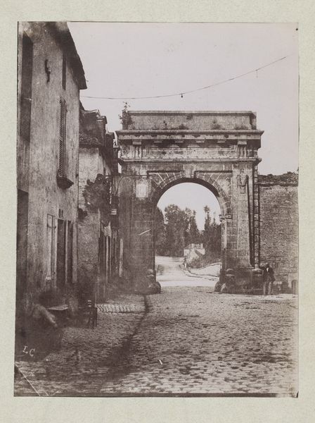 Curator: What strikes me immediately is the muted palette—the almost monochromatic range lends the photograph an austere and timeless quality. Editor: I can't help but feel this sense of history seeping from the stones; like I am standing on the precipice of centuries past, but perhaps I'm just romanticizing ruins again. Curator: The play of light and shadow also contributes significantly to the overall composition. Notice how the subtle gradations of tone delineate the architectural forms, highlighting the texture of the weathered stones and casting a contemplative atmosphere over the entire scene. We're observing Édouard Baldus’s photograph, "Nîmes, Porte d'Auguste," taken between 1863 and 1865, currently housed at the Metropolitan Museum of Art. Editor: Yes! I love that "contemplative atmosphere". The ruins sort of have this quiet, enduring presence and feel incredibly weighted by time and erosion—though you can also observe this intrusion of the modern city encroaching it from the top. It feels sort of lonely, isolated somehow, even in a busy urban context. Curator: Indeed. Baldus has carefully structured the image to emphasize the enduring nature of Roman architecture and he positions the viewer to recognize the intersection of past and present. One could deconstruct the framing as an attempt to illustrate the fragmenting and the preservation of civilization as it continues into the present, in which Baldus has intentionally employed symmetry and linearity. Editor: True, it is an incredible document. You notice these small, human elements poking through, like that bicycle, offering this funny tension to the picture and I am forced to ask, "Who is its owner and where did they come from? Curator: I find Baldus's methodical and detailed approach a brilliant synthesis of art and historical record. In his work, we perceive a deep understanding of both architectural form and the transformative power of photography as an art form and historical preservation. Editor: Right, maybe Baldus is attempting to demonstrate that ruins, in a way, possess the power to provoke contemplation. It sort of nudges the observer to muse on time, memory, and transformation, no? I enjoy these questions posed. Curator: Well put, Baldus’ photograph transcends simple documentation. It stands as an analytical framework. It gives one pause, compelling us to engage in this historical context critically and meaningfully. Editor: Precisely! These stones still murmur, don’t they?