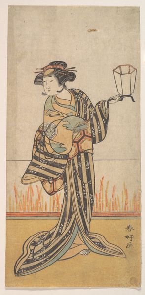 Editor: Here we have Katsukawa Shunko's woodblock print from around 1781, "The Actor Sawamura Sojuro III in an Unidentified Role." The expression on his face and the way he clutches that sword, there's a definite tension. What stands out to you? Curator: As a materialist, I immediately focus on the process. Look at the distinct key lines in the print: the carving of the woodblock dictates the limitations and the beauty of the image. Each colour would have required a separate block, a highly skilled and labour-intensive craft, think of the labour it embodies, each precise movement reflecting social hierarchies and consumption patterns of that time. Do you see how the flat planes emphasize form over illusion? Editor: Yes, it’s less about replicating reality and more about stylization. Is that intentional? Curator: Absolutely. Ukiyo-e prints were not 'high art'; they were mass-produced for a burgeoning urban audience. We need to think about the hands that created these, who distributed them, who purchased and consumed them. They provide insight into popular culture and economics, making us question the art-craft division. Note the actor’s robe: think about who created it? Whose labour ensured it’s unique quality. Editor: That’s fascinating, the material context influencing its value and how we understand the print. Curator: Precisely! Seeing it simply as an image, we neglect the vibrant cultural forces at play in its making and dissemination. Now, thinking about the cost of production versus consumption informs new questions, don’t you agree? Editor: I do! Considering the material realities completely shifts my perspective. Thanks! Curator: My pleasure. Remembering that the ‘how’ and ‘why’ of production enriches our appreciation beyond the purely aesthetic is key!