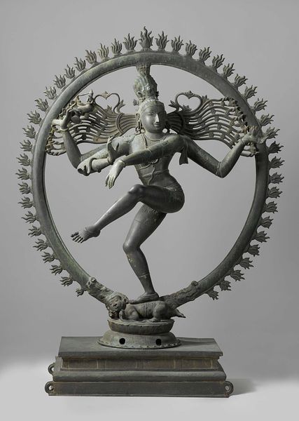 Curator: Editor: Here we have the "Shiva Nataraja (Lord of the Dance)," a bronze sculpture dating back to about 1100. I'm struck by the dynamism; the figure's pose is incredibly energetic despite being made of solid bronze. What catches your eye about this piece? Curator: It is a great example of materiality informing cultural practice. Bronze, the medium, connects to the social dynamics of its creation. Think about the labor involved – the mining, smelting, the lost-wax casting technique requiring specialized artisans. Who controlled access to the materials and processes? Editor: That's fascinating! I hadn't considered the labor aspect. How does that tie into the subject matter, the dancing Shiva? Curator: Well, the very production of this image becomes a ritualistic act. Each stage, from design to polishing, would have involved skilled craftspeople and religious specialists working together. Was the production a devotional act contributing to a patron’s or a community's prestige? How does the bronze itself become imbued with sacred qualities through this collaborative effort? Editor: So the value isn't just artistic, but also tied to the social and economic systems that enabled its creation? Curator: Precisely! Consider too the consumption – where would it have been displayed, and who would have interacted with it? The location influenced its meaning and the ongoing rituals that would further solidify the relationship between the sculpture and the community. Editor: That shifts my perspective. It’s not just about the religious figure but about the complex human network involved in bringing it to life as an object. Curator: Exactly. And that allows us to appreciate this sculpture on so many different levels, appreciating the work, craft, and ritual. Editor: I’ll never look at bronze sculptures the same way again! Thanks for opening my eyes to the material processes behind art history!