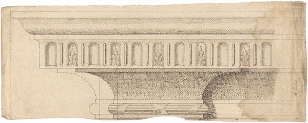 Editor: This is "Udkast til salen på Liselund," a pencil drawing by Joakim Skovgaard, created between 1930 and 1933. The figures seem classical or biblical in style. What narratives or interpretations can you draw from a work like this? Curator: It is a preliminary sketch, yes. I'm struck by its connection to power dynamics, particularly the church. Consider how religious institutions historically reinforce social hierarchies. Skovgaard, working in the early 20th century, engages with tradition. How does he challenge, or perhaps perpetuate, conventional power structures within that representation of a religious space? Editor: So, are you suggesting that even in what appears to be a simple sketch, we should be aware of underlying social and political ideas? Curator: Absolutely. Think about who is represented and how. Notice the implied relationships, and even the physical structure. It represents the artist’s intended audience, its message, and even its potential influence in shaping perception. It's crucial to consider these drawings as sites of ideological negotiation. Editor: That makes sense. I initially saw it as just a historical drawing, but it’s much more complex than that. Thanks, it's changed the way I will approach similar works going forward. Curator: Remember that art is never neutral, it always speaks from a certain standpoint. Thinking critically helps us interpret what that is.