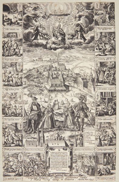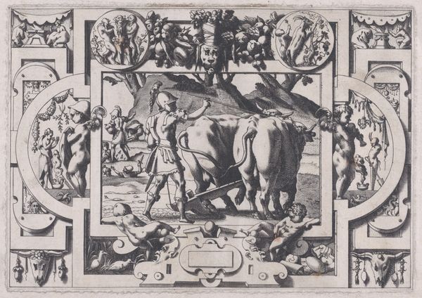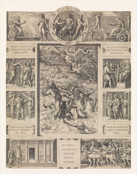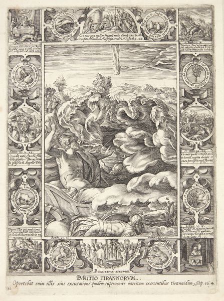 Curator: Hendrick Goltzius created this engraving titled "Straffen for tyranni," or "The Punishment of Tyrants," in 1578. The work, now housed at the SMK - Statens Museum for Kunst, showcases a dramatic scene rendered in the Northern Renaissance style. Editor: Wow, that’s intense! My first impression is one of, like, super high drama. You’ve got these almost cartoonishly muscular guys in hell being stabbed… It feels over the top but mesmerizing at the same time. What's the story behind it all? Curator: Well, considering its historical context, this piece reflects a common sentiment during the late 16th century, a period of considerable social and political upheaval, especially given the context of the Dutch Revolt against Spanish rule. The artwork is not just a visual spectacle; it’s a political statement. The tyranny being punished here resonates with the contemporary struggles against oppressive rule. Editor: So, less generic "hellscape" and more targeted "message about sticking it to the man?" I dig that. And the bodies really grab your attention, like Goltzius is saying, "look at what tyranny really does." I love how theatrical it is; the flying figure above—he seems to be falling *away* from grace. Curator: Precisely. The bodies are contorted, exaggerated – Baroque drama before the Baroque! Also, the decorative borders—notice the biblical scenes embedded within them? They contextualize the central image and broaden the scope of tyranny to be understood as a more general historical and moral issue. The Latin inscription also makes a plea against leaders’ oppression of their people, who face anger when subject to tyranny. Editor: It's an entire argument against oppression distilled into ink! That’s why I always keep coming back to these old masters. Thanks for giving me more of the story here, it has completely deepened my view. Curator: Indeed, seeing art this way empowers us to address issues and think critically, seeing art as a call for change, much needed for a long time.