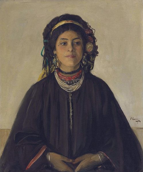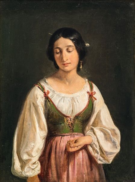 Adolph Tidemand painted this portrait, "A women named Anunziata in Subiaco," using oil on canvas. The material qualities of oil paint - its viscosity, slow drying time, and capacity for blending – allowed Tidemand to capture the soft textures of Anunziata's clothing and skin, and a complex rendering of light and shadow. The smooth surface is a testament to the skilled labor involved in preparing and applying the paint, as well as the artist's mastery of brushwork. The painting also provides a glimpse into the modes of production and consumption of clothing and instruments in 19th-century Italy. Anunziata's traditional dress, likely made from locally sourced materials, speaks to the persistence of regional craft traditions in the face of industrialization. The tambourine she holds also alludes to a rich culture of folk music and dance. Considering the materials, making, and context, the full meaning of this artwork is that of a record of a specific time and place, as well as a celebration of the human figure, which challenges traditional distinctions between fine art and craft.