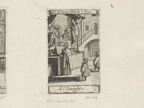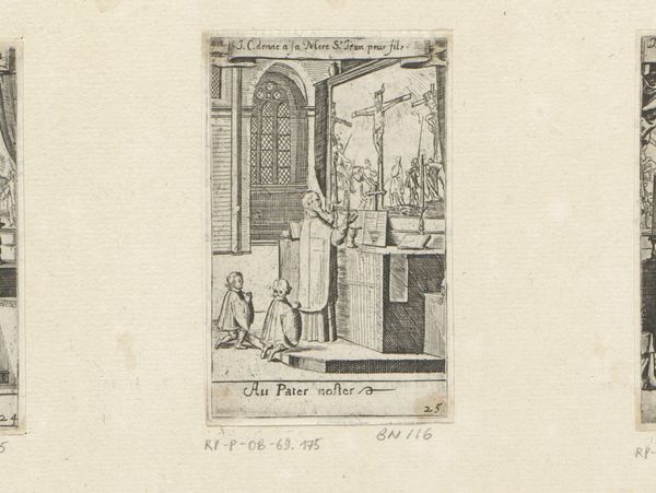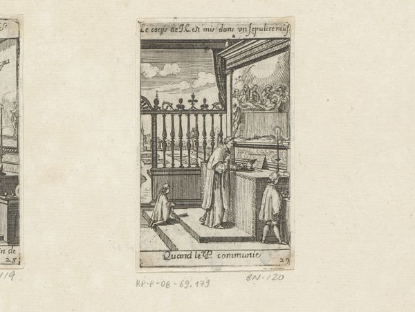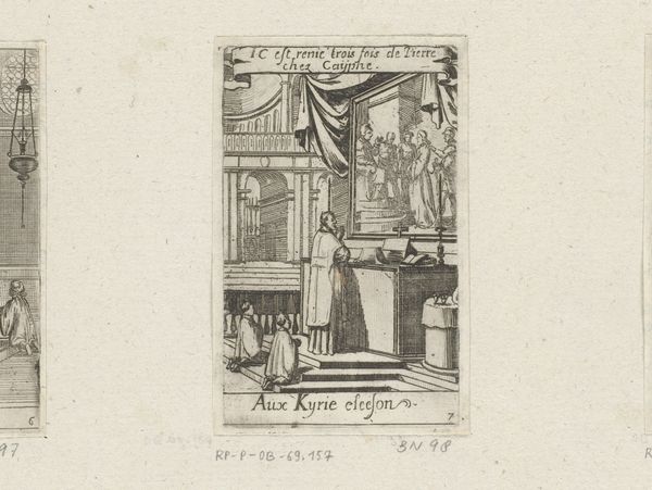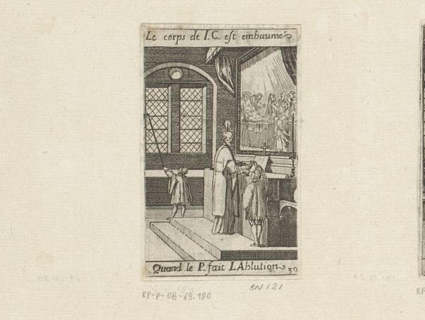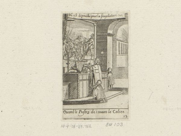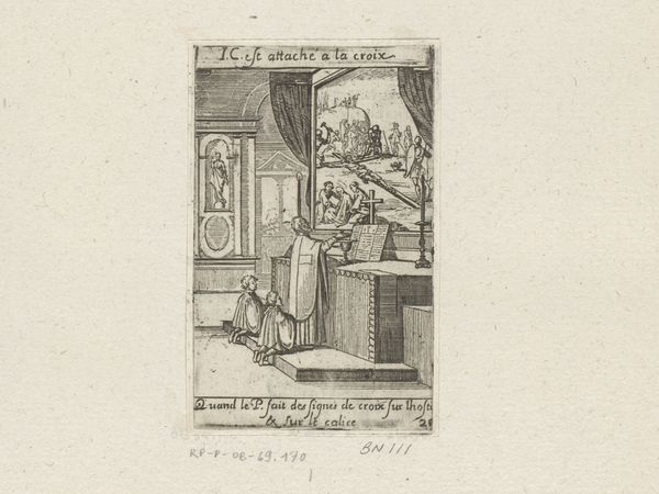 This engraving of a priest and altar boys is by Sébastien Leclerc I, who was active in France in the late 17th and early 18th centuries. It gives us insight into the visual culture of the Catholic Church during the Baroque era. Leclerc’s image presents a priest conducting mass before an altar, with a painting of the crucifixion behind him. Details like the architectural setting and the clothing of the figures reflect the aesthetic preferences of the time. Consider how the social and political context of Louis XIV's France might have influenced Leclerc, as a member of the Royal Academy of Painting and Sculpture, to create imagery reinforcing religious and monarchical authority. Note the inscription in French, evidence of the artist’s intention to engage with a local audience. The image also provides a window into the religious practices of the period and reminds us of the church’s power during this era. Further understanding of this print could be found in period documents, theological texts, and studies of French Baroque art and society. Appreciating art like this depends on understanding its contingent relationship to social and institutional history.