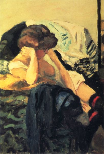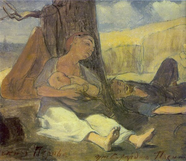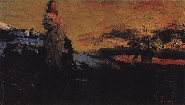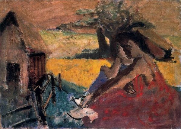 Curator: Before us, we have Giovanni Fattori’s "Lady Sitting Outdoors," an oil-on-panel work from 1866. Editor: It strikes me immediately with its almost nonchalant brushstrokes. It's relaxed and seems utterly unconcerned with high society portrait conventions. The material reality of paint dominates the scene. Curator: Indeed. Fattori, aligned with the Macchiaioli movement, was keen to depict everyday life outside of academic constraints. There’s a distinctly modern feel to this, capturing a woman, presumably from the bourgeoisie, in leisure. But let's think about her specific positioning, alone in nature. It suggests a kind of independence, doesn’t it? One must question to what degree, being this was still quite socially constrained in the mid 19th Century. Editor: I agree there's a tension. The apparent freedom suggested by plein-air painting confronts the limitations of gender and class at that time. The textures are captivating; see how roughly the landscape is suggested, versus the comparative attention given to the fabric of her dress. It looks more "finished." It calls attention to its means of production – a privileged product for privileged people! Curator: The way light is used adds to this tension. It glances off her parasol, which in turn, casts some shadow across the woman, giving some dimension. It also, quite literally, protects her from something which working class women out in the country did not have to hand to offer such shelter from the sun. The act of sitting like that, not tending land, not in the midst of productive labour… It is a loaded visual shorthand that implies wealth. Editor: Precisely! We can consider the pigment choices, the weave of the panel he selected as part of a socio-political statement through these methods of crafting and deploying such paints. The seemingly casual technique deliberately subverts traditional art's polished illusions. This wasn't just about replicating the scene; it was about highlighting a social position and material circumstance. Curator: So, both the lady and the method underscore access to a privileged kind of experience – freedom from certain expectations and labors which are, essentially, unattainable for most people at this time. It provokes questions about identity and spectatorship as the landscape genre gets infused with portraiture to showcase a bourgeois female figure in a moment of what? Reflection? Boredom? Editor: For me, the materiality serves the context in a poignant way. A record, perhaps even unwittingly on Fattori's part, of 1866 society captured within the layering of each brushstroke and their ultimate arrangement into this image of a single lady taking a pause in a painted, landed estate. Curator: Thanks, that’s given me cause for further reflection and research! Editor: My pleasure. I appreciate thinking about her – her placement, and what surrounds her – from your point of view, too.
