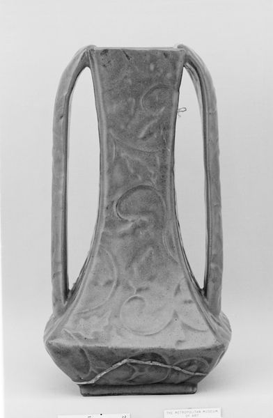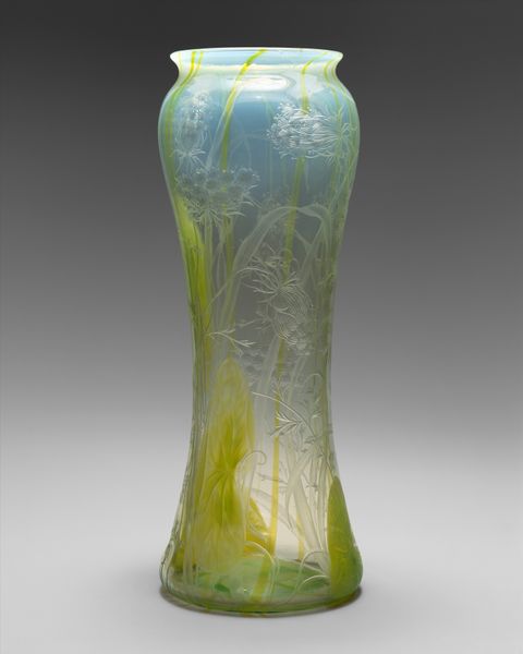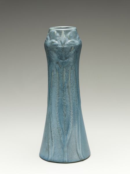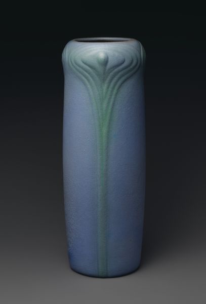 This is a vase with incised decoration and reflet métallique glaze made by De Porceleijne Fles. This piece is an interesting exploration of surface and light, typical of the Art Nouveau movement. It stands as a cultural artifact reflecting shifting artistic identities in the late 19th and early 20th centuries. The metallic glaze, a key feature, engages with the historical context of industrialization. We can read the glaze as a metaphor. The fluid, shimmering surface challenges the period’s rigid social norms, reflecting a desire to escape the constraints of traditional representation. The incised decoration adds another layer, hinting at a struggle between control and freedom. The vase transcends mere decoration; it embodies the era's tension between tradition and progress, control and liberation.