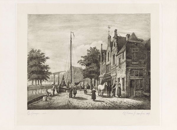Cornelis Springer made this city view with horse cart in 1855 using etching and paper. The artist would have applied a waxy ground to a metal plate, then scratched an image into it with a needle. When acid was applied, it bit into the exposed metal, leaving behind an intricate network of incised lines. The choice of etching as a medium carries its own social weight. Unlike painting, which was often the preserve of the wealthy, etching lent itself to reproduction, and therefore wider distribution. The city scene, bustling with everyday life, is meticulously rendered, and the lines of the etching capture the grit and texture of the urban environment. Look at the figures, rendered in fine detail, engaged in various activities, and consider the labor implicit in the scene – the loading of carts, the sweeping of streets, and the general commerce of the city. In appreciating this etching, we are reminded of the complex interplay between art, labor, and the everyday.