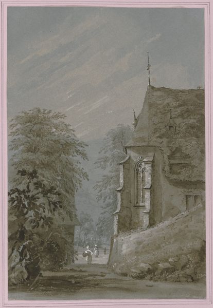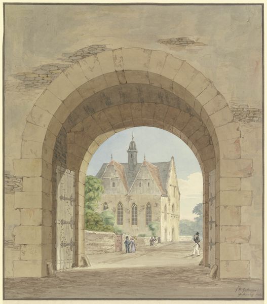 Marietta Minnigerode Andrews created this watercolor painting, "Glimpse of the Palazzo Doria, Genova," on paper. The pale washes of color create a dreamy, almost ethereal scene. The composition is structured around a large arched gateway in the foreground, acting as a frame through which we view the Palazzo Doria perched atop a verdant hill. This architectural framing device draws our eye toward the upper reaches of the paper, where the building and the sky meet. Andrews skillfully uses perspective to create depth. The Palazzo Doria is rendered with enough detail to suggest its grandeur, yet it remains partially obscured by trees, hinting at the many layers of history and culture embedded within this Italian landscape. This piece functions as both a visual record and an evocative exploration of space and perception.