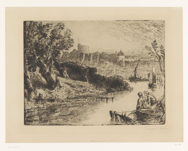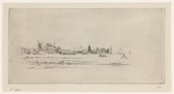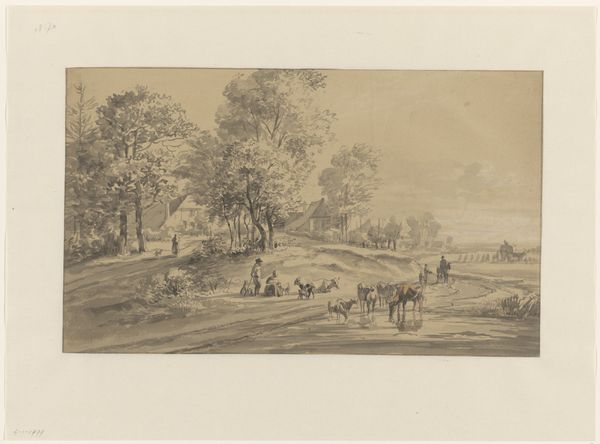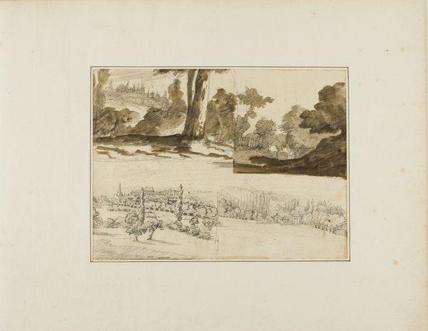 Jacob Esselens created this vista of a pond using pen and brown ink. At first glance, the drawing presents a serene landscape, but look closer and the details reveal a complex interplay of form and space. The composition is structured by horizontal layers: the foreground with figures, the water expanse, the wooded middle ground, and the distant hills. Esselens’s use of line—varying in thickness and density—creates texture and depth. The trees, rendered with delicate, almost scribbled lines, contrast with the smoother reflections in the water. This contrast invites us to consider how perception shapes our understanding of space. The figures, small in scale, are integrated into the landscape, almost consumed by it. This could be interpreted through a semiotic lens: the figures as signs, representing humanity's place within the natural world. The drawing, therefore, is not just a depiction, but an active statement about the relationship between people and nature. The open sky at the top functions as a signifier of limitlessness, contrasting with the defined edges of the drawing. The landscape isn’t simply observed; it’s actively framed, prompting endless interpretation and discussion.