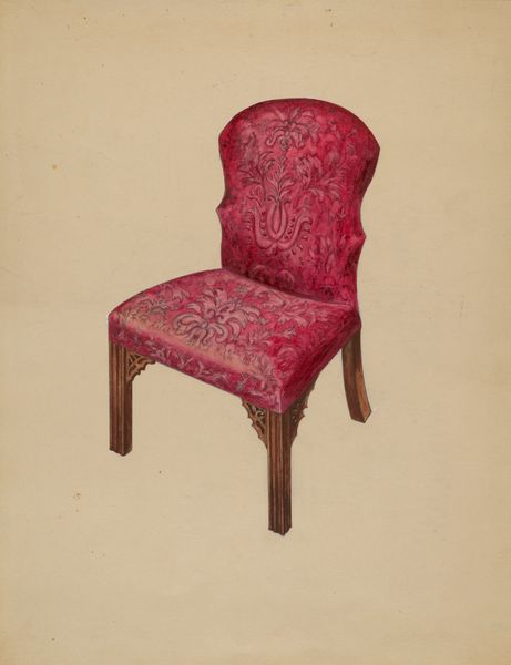 Curator: Let's turn our attention to this intriguing watercolor and pencil drawing titled "Gothic Style Chair with Dark Wood Frame and Maroon Upholstery," created in the 19th century. Editor: Immediately, I see a powerful image of authority. That high back, the rich maroon…it feels more like a throne than a chair. Is this drawing about more than just furniture? Curator: I think that's an astute observation. While on the surface it's a study of a chair, we must consider the Gothic Revival period, where there was a conscious effort to reclaim symbols of power and religious authority often intertwined with a desire to define national identities. Who was entitled to sit on such a chair and what that said about their social standing becomes relevant in thinking about the social climate of the period. Editor: Right, the Gothic style itself is a potent symbol, evoking cathedrals, knights, a whole medieval worldview. That deep red upholstery, almost blood-like, suggests sacrifice, or even a martyrdom associated with power. Was it meant to be a status symbol? Curator: Undoubtedly, these chairs were symbols of elevated status. The selection of deep wood, that specific shade of maroon, speak to deliberate decisions based in class and artistry. Think of who commissioned and who would possess these, in contrast with those who may never even have touched it. It evokes an imbalance in wealth, visibility and material treatment within those power structures. Editor: Looking closer, the ornamentation also draws my eye. The artist has lovingly illustrated repeating pointed arches. As architectural metaphors, do you believe these reference the Church? Curator: They can definitely reference the church, however that's not all they may encompass, those are shapes deeply enmeshed in various spiritual and temporal concepts and customs, where those visual signifiers act almost as psychological markers. And as you point out the meticulous detailing underscores an emphasis on memory, continuity, but also, importantly, control through iconography. Editor: Absolutely, this piece holds the viewer within the memory of a moment in a tangible way. Curator: I agree; hopefully these reflections will enable a better appreciation of the artwork. Editor: It has for me; thanks to those layered elements we uncovered in its architecture and color composition!