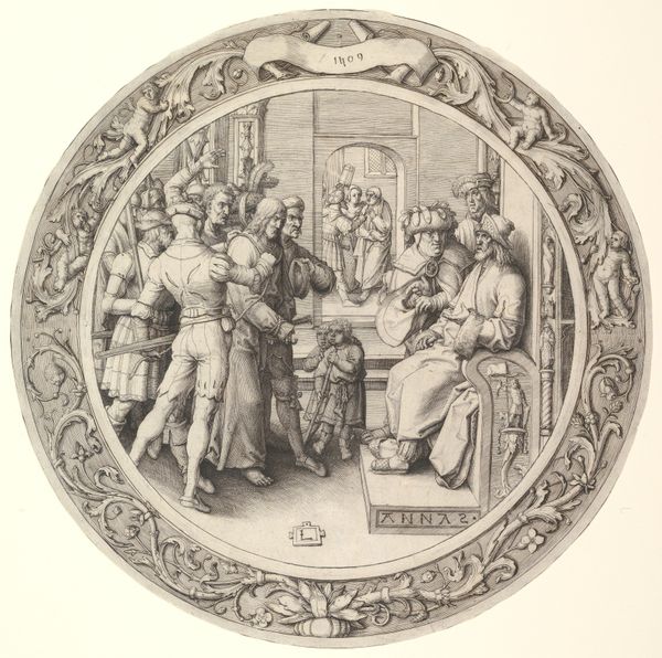 Curator: The delicate watercolor before us, created circa 1512 by an anonymous artist, depicts "Jozef verklaart de dromen van Farao," or Joseph Interpreting Pharaoh's Dreams. It resides here at the Rijksmuseum. Editor: There’s a strange stillness to this piece, despite the number of figures. The limited palette and almost miniature details give it an otherworldly feel, like looking into a forgotten storybook. Curator: The choice of watercolour lends itself well to that intimate storybook feel. Its application creates soft lines that still convey the wealth and status of Pharoah. In the context of the Italian Renaissance, art patronage shifted toward courtly subjects, imbuing historical narratives with moral and political significance. It highlights an interest in reclaiming and visually portraying moral tales of power. Editor: And that makes me think about how such visual narratives shaped the social and political consciousness of the time. Consider Joseph's journey from slavery to advisor—a narrative ripe with possibilities for critiquing power dynamics. How might this scene reflect or subvert those existing hierarchies? Curator: Certainly. Art became a medium for social commentary, though often veiled within biblical narratives. The way Pharaoh is positioned, slightly above everyone, in fancier dressings than all, underscores the established hierarchy but Joseph’s forthright gaze, hints at his growing influence challenging such system. Editor: It's in the gaze, isn't it? Consider who is looking where in this tableau; the artist almost invites us to analyze who holds power and whose gaze shapes the narrative. Do we see it in the architecture as well? What about the role of the viewer of this watercolor? Curator: Absolutely. The architecture mirrors that hierarchy. While Joseph is closer to us, the viewer, the grandeur in Pharoah's surroundings subtly places him on a plane above Joseph. The scene itself places the viewer in the role of voyeur, as an observer, in this scene where the fate of many rests. Editor: The detail is mesmerizing, when we consider its function. The miniature execution would imply private contemplation of these biblical motifs. Examining "Joseph Interpreting Pharaoh's Dreams," allows us a glimpse into a worldview shaped by faith, power, and maybe even a little bit of rebellious questioning. Curator: I find that my understanding has been truly enriched. I hadn't really thought of how voyeuristic the setting really seems before you suggested it. Editor: And for me, thinking of the place this water-coloring would hold within private devotion helps connect it with political power in the renaissance.