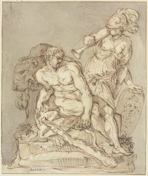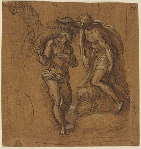 Curator: Here we have a drawing attributed to Sebastiano del Piombo, "Lamentation of Christ," currently held at the Städel Museum. What strikes you first? Editor: It feels immediate, visceral. There's a rawness in the chalk and ink medium, almost like we are witnessing the very moment this scene unfolds. It lacks a certain polished finish that feels appropriate given the somber theme. Curator: Precisely. The medium is critical here. The combination of chalk and ink allows for both the softness of the forms and the sharp, defined lines, creating a beautiful study in contrasts. Note how the light catches Christ’s body versus the weeping figures surrounding him. Editor: I'm curious about the quick, expressive lines. It’s intriguing to imagine del Piombo in his studio, wrestling with the material—perhaps charcoal dust getting everywhere! This piece gives such insight into the hand of the artist, the labor involved in creating such a poignant representation of grief. Curator: It invites contemplation on artistic process and its interplay with emotive expression, but there’s also a level of symbolism here. The High Renaissance values of order, clarity, and idealized beauty, while evident, are softened by the intense emotions conveyed. Editor: Speaking of intense emotions, there seems to be a real struggle within the materiality of this image to capture grief through human form. I'm thinking about how pigment was obtained at that time and its value. It affects my viewing. It deepens my sense of human cost here. Curator: And how this medium would lend itself to easy transfer of ideas. Perhaps preliminary work toward something monumental. Even in its apparent simplicity, "Lamentation of Christ" engages with powerful traditions. The dynamism achieved in ink captures fleeting expression and fleeting pain. Editor: Considering our perspectives, it makes you consider art as a convergence—process and reception entwined in material form. Curator: Yes. A perfect synthesis to take with us, don't you think?