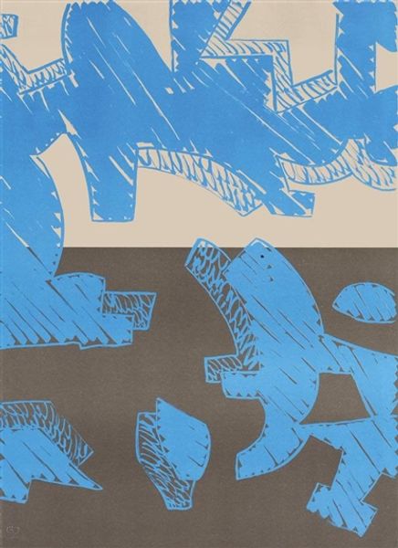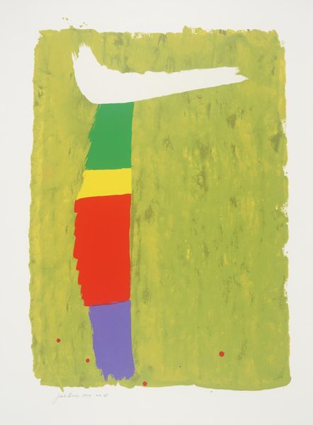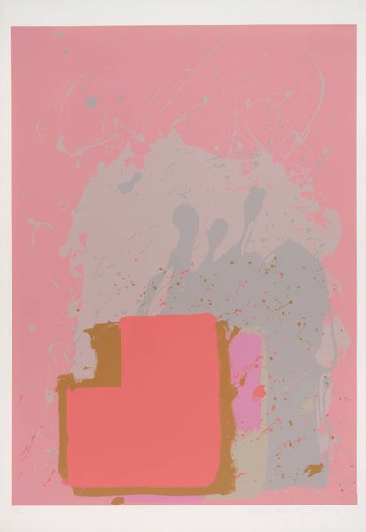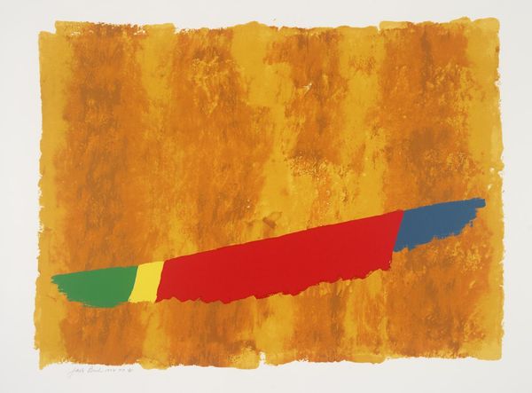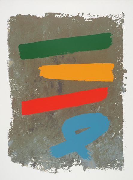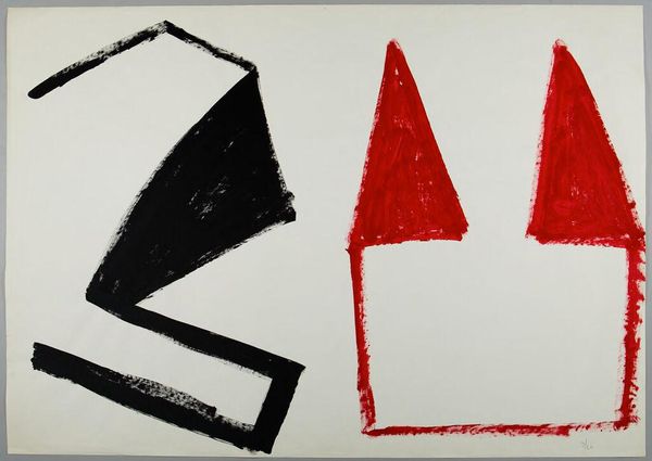 Curator: Jack Bush's "Red M," held in the Tate Collections, strikes me as immediately bold and energetic. Editor: Indeed, it's a striking image! The large red zigzag dominates the composition. We should consider Bush's position within the art market of his time and how these abstract forms gained value. Curator: I see that red as a defiant statement. What social and political narratives might be embedded in such a large, unapologetic form? Does it challenge notions of propriety within the established Canadian art scene? Editor: Perhaps. Abstract Expressionism was gaining traction, and institutions like the Tate played a key role in legitimizing it. This piece may be less about overt defiance, and more about participating in that evolving discourse. Curator: I still see a raw, almost visceral quality to the brushstrokes. It feels like a rejection of traditional artistic constraints. Editor: The public's reception of such abstraction would have been mixed, conditioned as they were by more conventional art forms. Its entry into a major collection like the Tate signifies a shift in taste. Curator: The play of colors certainly invites discussion about the politics of abstract form. Editor: Precisely. It's a fascinating example of how abstract art became institutionalized.