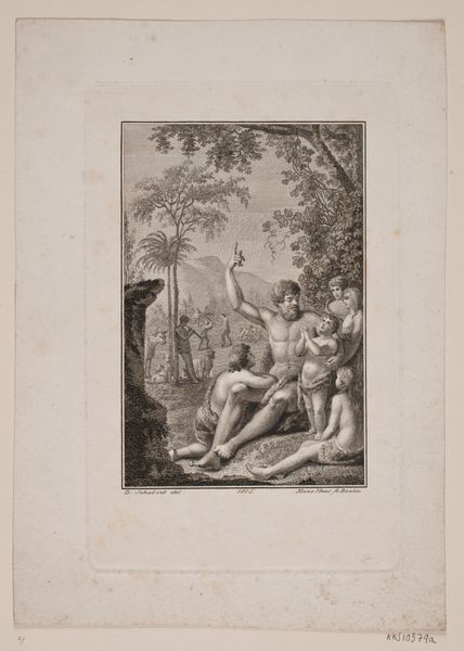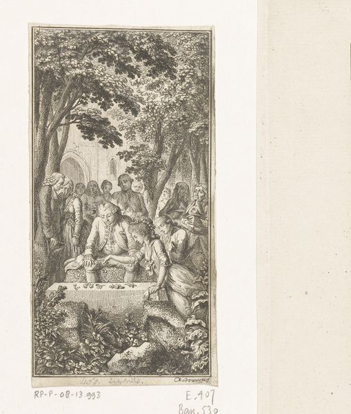 Curator: What an intriguing print. Daniel Nikolaus Chodowiecki created this engraving in 1784, depicting "The Musical Contest Between Apollo and Marsyas." It's currently held in the Rijksmuseum. Editor: Right away, it hits me as almost theatrically poised. The scene is framed by trees that act as curtains, and the figures, especially Apollo, are presented with such pronounced gestures. Curator: Precisely. Chodowiecki employs line and form meticulously. Note the contrast in textures: the smooth, idealized body of Apollo juxtaposed with the rough, almost grotesque features of Marsyas, the satyr. It establishes an opposition right away, one might read the composition as Apollo and Marsyas standing as signifiers to classical structure versus untamed energy. Editor: It's the human versus the… well, more than human, isn't it? There's something rebellious and earthy about Marsyas, clutching his violin, while Apollo basks in divine, radiant light, radiating arrogance even. The details within Marsyas entourage creates this feeling that they've entered on this space to challenge a long-held musical and moral reign. Curator: Consider also the gaze—Apollo appears detached, self-assured, in direct contrast to Marsyas who seems passionate but vulnerable. Chodowiecki effectively builds a complex power dynamic solely through gesture and composition. The contest then is more than mere talent, but also divine prerogative. The print becomes a study in contrasts—light versus shadow, order versus chaos, divinity versus humanity. Editor: Looking at it this way, I get this gnawing sense that it is about human hubris… I see Marsyas trying to touch something untouchable, not just in art, but maybe existence. I guess it's what makes it captivating even if I know this contest is destined. It gives a feeling of daring, right? A story to root for, and be reminded we must have some degree of caution in ourselves. Curator: Ultimately, this small print contains an entire philosophy in a very structured presentation. It represents an understanding of the world based on binaries: beautiful and grotesque. What one has to understand in its entirety, to read an effective discourse. Editor: Indeed, and maybe sometimes its these structured, orderly confrontations that unlock that energy from something rebellious like Marsyas that brings forward conversation. It's made me rethink about the delicate interplay in structure to find innovation in anything really.