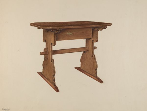 Rex F. Bush made this Pa. German Hutch Table. The watercolor on paper depicts what was originally a 29-inch-high hutch table, showcasing the material of wood and the techniques of woodworking. The table’s design reflects a specific cultural tradition, that of the Pennsylvania Germans, also known as the Pennsylvania Dutch. The careful, precise rendering emphasizes the joinery and surface treatment of the wood, highlighting the table's functionality and aesthetic appeal. The choice of watercolor on paper as a medium is interesting, because it invites a different kind of appreciation than would the object itself. It encourages a focus on form and detail, rather than on the heft and physical presence of the wooden table. Bush’s artwork also prompts consideration of the social context in which such furniture was made and used, reflecting a practical, hardworking lifestyle and the artistic expression embedded in everyday objects. The aesthetic suggests the maker's close relationship to craft, as distinct from fine art.
