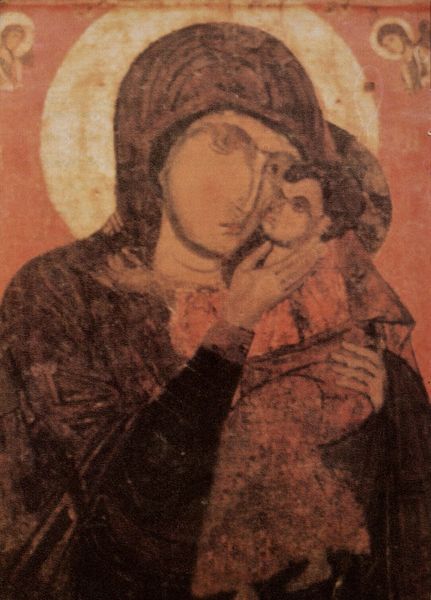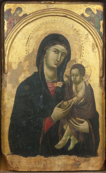 Curator: This painting, titled "Coronation of the Virgin", was completed by Duccio in 1311. It's tempera on wood, and currently held at the Budapest Museum of Fine Arts. What strikes you about it at first glance? Editor: The overwhelming sense of quiet reverence. Despite being a scene of immense power and elevation, the colour palette and the Virgin's bowed head evoke a stillness, a sense of internal contemplation more than outward triumph. Curator: Absolutely. Consider the historical context: this was a period of immense religious significance. The Coronation theme had become a standard representation of the Virgin's importance. But Duccio subtly subverts the visual expectation for glorious ostentation. It is Sienese school, and their interpretation feels so unique. Editor: It’s the muted colour scheme, isn't it? Browns, dark reds…they seem almost earthy, rooting the scene in a tangible, human world even while depicting a divine event. There's something so human about the angle of her bowed head, too, a hint of humility. It makes the scene feel much more intimate. Curator: Look at the patterns in her cloak and robe, at the orb-like jewels punctuating the surface; these repetitive designs help transmit an ethereal quality, transforming the cloth into symbolic tapestry that elevates this work into the sphere of sacred imagery. She's a conduit to divine power, but portrayed with a palpable sense of human emotion. It also helps illustrate a collective memory. Editor: Collective memory in what sense? Curator: Representations like this reaffirm stories and values central to faith, solidifying communal religious beliefs. The constant retelling, visually or orally, ingrains shared cultural experiences through easily read iconographic symbol, cementing these values across generations. It is why they remain important in art history. Editor: That resonates. It isn’t just the religious symbolism though. Crowns as power symbols are everywhere across multiple political contexts. This isn’t a new message and helps us consider this scene not in isolation, but among centuries of images with similar semiotics of authority. It's a brilliant depiction that shows how images can carry cultural significance far beyond their original moment. Curator: Precisely! Reflecting on its historical placement while also contemplating its ongoing echoes... Editor: The nuances continue to fascinate.