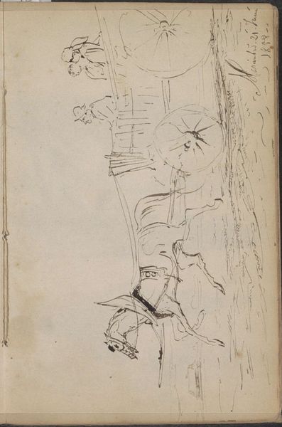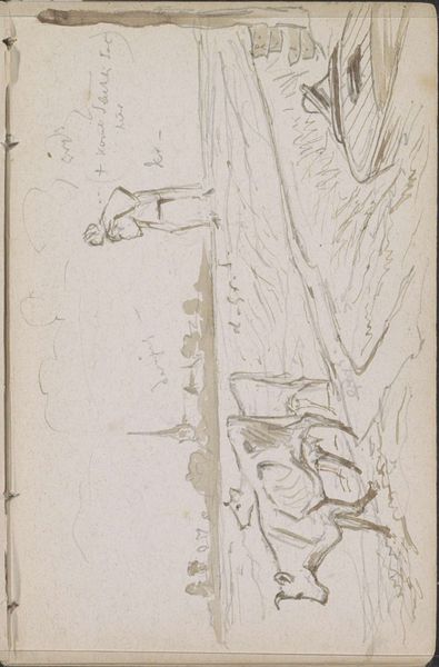 Editor: Here we have Jan Baptist Tetar van Elven's "Heilige Hieronymus," a pen and ink drawing on paper, made sometime between 1843 and 1864. The sketchy, almost frenetic lines create a very intimate feeling, like we’re glimpsing a private moment. What do you see in this piece? Curator: I see a deep engagement with the material conditions of artistic production. Consider the humble materials: paper, pen, ink. These are readily available, cheap. Yet, through skillful labor, they’re transformed into an image evoking complex narratives. Note also how the "intimacy" you perceived could also stem from its being a preliminary sketch – revealing the artist's process, rather than a finished commodity. Do you think this drawing challenges any assumptions about what constitutes 'high' art? Editor: That's a great point about challenging 'high' art. I hadn’t considered how the seeming informality, because of the visible process, pushes against academic polish. It almost feels subversive, democratizing the act of creation. Curator: Precisely! The medium’s accessibility and the sketch-like quality hint at a different relationship with labor and consumption. What narratives do you think it suggests? The labor behind devotional practice mirrored in the labor of art production itself? Editor: It really reframes my understanding. The skull suddenly feels less like a symbol of mortality and more like another material object within his workspace, considered together with books, pen, paper, and of course his intellectual labor as a form of making. It really equalizes everything! Curator: Exactly! By focusing on the materials and production, we gain insight not just into artistic skill but into the broader social and economic context shaping artistic creation and consumption. It disrupts traditional art historical narratives by emphasizing making over pure aesthetics or biography. Editor: I see now how understanding materials helps reveal social and economic forces within art production. Thanks! Curator: Indeed. Examining the process helps unlock richer and perhaps less obvious cultural insights.