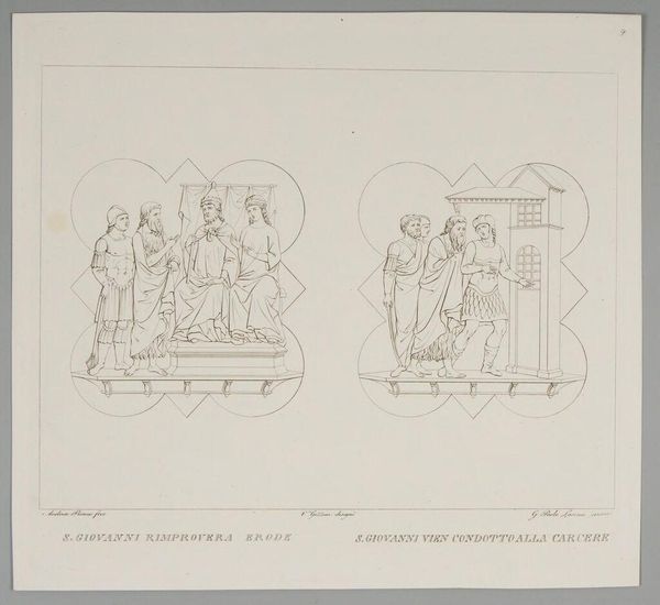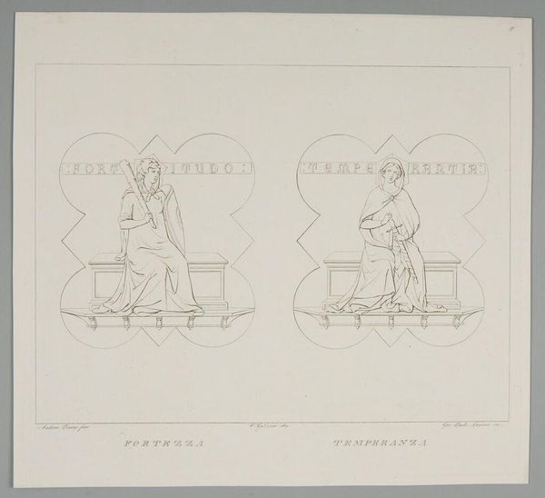 Curator: There’s something so ethereal about this piece. It reminds me of old illuminated manuscripts, delicate and full of grace. Editor: This etching by Giovanni Paolo Lasinio depicts details from the South Door of the Baptistery of Florence. It offers a glimpse into the historical context of religious art and its public display. Curator: Right, but look at the figures! One bearing the inscription of Hope, the other Faith. Their stillness almost feels like a paused prayer, a moment suspended in time. Editor: Indeed. Lasinio's work allows us to consider how virtues were visually encoded and communicated to the public. Note, especially, how the figures are arranged in these quatrefoil shapes. Curator: Yes, a little like capturing butterflies in a net of faith. Editor: Exactly, and this particular piece reflects the 19th-century trend of documenting and disseminating knowledge of Renaissance art. It’s interesting how these prints helped shape public understanding and appreciation. Curator: I leave feeling hopeful that we can always go back to see those butterflies through the doors! Editor: Ultimately, artworks such as this bridge historical artistry with modern interpretation.