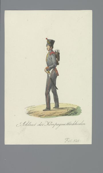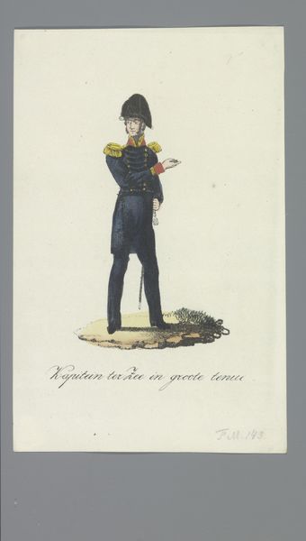 Albertus Verhoesen created this small drawing entitled 'Trompetter der Rijdende Artillerie'. The vertical composition centers on a trumpeter whose figure is constructed with a network of fine lines. Notice how the artist uses line to define the contours of the figure as well as to suggest the folds and textures of the uniform. Verhoesen’s approach is deeply rooted in a semiotic tradition, where each color and form signifies specific social codes and hierarchies. Red, prominently displayed, symbolizes valor and authority. The gleam of gold on the trumpet and epaulettes represents status. Even the white plume atop the trumpeter's hat serves as a visual marker of his role. The figure stands on a small patch of land. This compositional choice grounds the figure, but it also elevates him, suggesting a stage. The artist underscores the theatricality of military display by rendering the figure as if on exhibit. In the context of its time, this work serves not merely as a portrait but as a study in the visual rhetoric of power and identity.