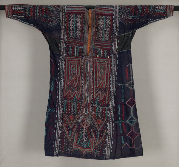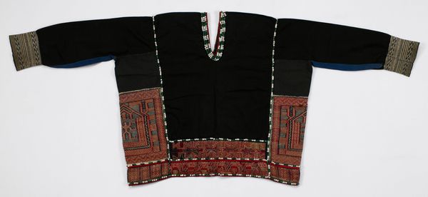 This "Blouse with Attached Skirt" by the artist Li offers a compelling study in textile art. Dominating the visual field is a stark contrast: a large black expanse that sharply transitions into dense, colorful embroidery. This composition establishes a clear dichotomy between the unadorned and the ornate. The form subverts traditional categories by attaching a skirt to a blouse, creating a singular garment that challenges expectations of separate clothing pieces. The black area, seemingly simple, functions as a structured ground for the embroidery, thus highlighting the vibrant patterns and motifs. Notice how the artist uses geometric shapes and symbolic figures to construct a visual language, one in which each element contributes to a larger narrative. The piece destabilizes the familiar notions of clothing, inviting us to consider how form and decoration can redefine cultural artifacts. The interplay between dark, unembellished fabric and the detailed, colorful designs functions not just aesthetically but also as a part of a larger cultural and philosophical discourse.