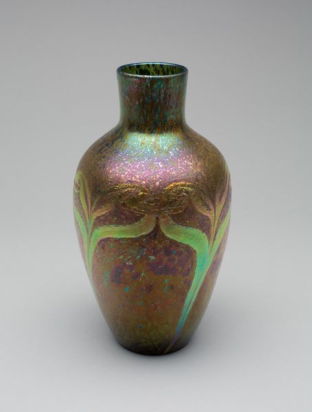 Curator: Let’s discuss this earthenware vase crafted by Chelsea Keramic Art Works sometime between 1882 and 1892. What's your initial take? Editor: It immediately strikes me as an object of warmth and subdued passion. The iridescent glaze is really beautiful; almost like looking at molten metal cooling. It feels alchemic. Curator: That glaze is a significant part of the work. Notice how the mottled texture catches the light. The chromatic play generates complexity across its subtly contoured form. We could even say it abstracts the idea of the vessel, transforming it into an exercise in light and shade. Editor: Absolutely, and considering the Arts and Crafts movement context, I read a desire to reclaim beauty from industrial standardization. Isn’t this vase a kind of quiet rebellion? Its uniqueness stands in stark contrast to mass-produced objects, advocating for handcrafted beauty and perhaps subtly critiquing societal homogenization through artistic expression. Curator: Interesting point. Though some may argue the functional intention diminishes its avant-garde credentials, let's consider its craftsmanship. The form itself is a masterclass in controlled asymmetry; see how the lip and base diverge from true circles ever so slightly, imbuing it with an organic presence. Editor: Yes, that asymmetry, along with the somewhat uncontrolled nature of the glaze, lends the vase an element of surprise, destabilizing it, so that the work engages in the realm of aesthetic experience and perhaps even disrupts rigid societal norms by celebrating the unexpected. Curator: A powerful point! Considering its date of production, such pieces democratized art, making it part of everyday domestic space. Editor: And elevating that space! I am compelled by this fusion of practicality and subtle disruption, all within one, relatively simple object. Curator: Indeed, its material language continues to echo across our present moment. Editor: I will think about function and subversion the next time I arrange flowers!