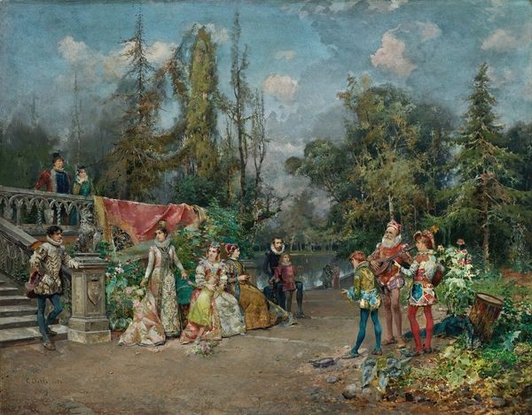 Luc-Olivier Merson painted ‘Sacrificing Dolls’ using oil on canvas, a traditional material in fine art. The artist uses visible brushstrokes to construct the scene, layering paint to give depth to the figures' robes, the altar, and the surrounding landscape. Oil paint allows for a great degree of realism, with meticulous attention to light and shadow. But Merson's loose, painterly approach here lends the scene a sense of movement and life. The canvas itself provides a woven ground for the image, its texture interacting with the oil paint to produce the final effect. 'Sacrificing Dolls' is an allegory of a lost Classical world. The medium of oil on canvas, itself a product of centuries of European artistic tradition, ties the work to a specific cultural and historical context. While oil painting has long been associated with 'high art,' this connection shouldn't diminish our appreciation for the skill and craft involved in creating such a work. Merson’s painting invites us to consider the materiality and labor involved in the creation, as much as the final image itself.