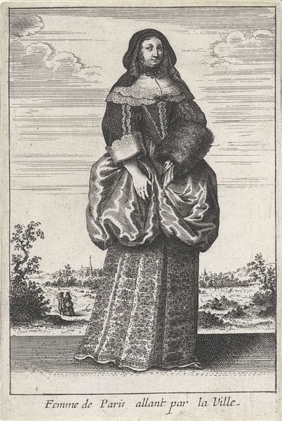 This engraving, 'Femme d'Anvers allant par la Ville', portrays a woman from Antwerp, captured with meticulous detail. Her attire, especially the headwear, is not merely decorative; it speaks volumes of her status and the cultural milieu of her time. Consider how gestures and postures echo across centuries. Here, the woman’s composed stance and clasped hands evoke a sense of modesty, a recurring theme found even in ancient Roman portraiture. Think of the veiled figures in Renaissance paintings or the draped Madonnas of medieval art. This motif of concealment and revelation, seen in the woman’s veil, stirs a deep, subconscious recognition. The symbolic weight of clothing, its ability to both conceal and reveal, speaks to the complex interplay between inner emotion and outward appearance. Like a recurring dream, this woman embodies a timeless archetype, continuously reshaped yet fundamentally unchanged.