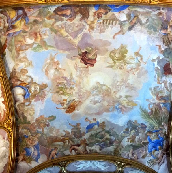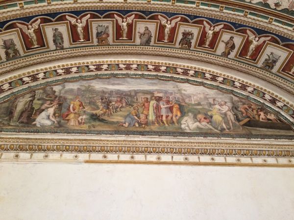 Curator: Standing here, looking up, we are face to face with "Volta," a fresco tempera painting from around 1515 by Jacopo Pontormo. Editor: My neck hurts already, but wow, what a party of colours up there! It's like Renaissance-era fireworks, if fireworks were made of cherubs and elaborate squiggles. Is it me, or is it fighting for attention in a major way? Curator: It certainly reflects a dynamic moment in Italian art, when decorative excess and the illusion of space were highly valued. These ceiling frescoes were powerful symbols of wealth and sophistication, showcasing the patron’s cultural capital. Editor: "Cultural capital"—I love that. I can almost hear the patron saying, “My ceiling is fancier than your ceiling!” But seriously, the perspective trickery must have blown people away back then. It’s like they’re trying to create an entirely new world on this ceiling, full of symbolic narratives about the patron’s power and virtue, that ordinary people could marvel at! Curator: Precisely. Pontormo was playing with perceptions, challenging the viewer’s sense of space and employing a highly ornamental vocabulary to reinforce the patron's image and importance. It’s no accident that these themes of greatness were tied to visual excess. Editor: I suppose the interesting thing is that while the brushwork is so expressive and so loose, these kinds of interiors must also be so staged and managed. All those beautiful squiggles were for a political end! Still, even seeing this image in 2D now, I feel transported. You’ve gotta love art's ability to give people, past and present, something to daydream about. Curator: I completely agree. It serves as an insight into the values of the period while inspiring aesthetic appreciation. Editor: Well, now that we know what we're looking at I think it may be time to have a look around, if I do say so myself!