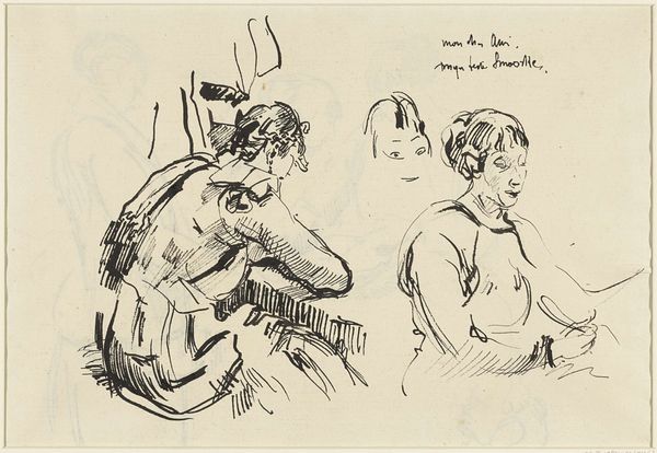 Curator: I find this 1908-1909 ink drawing by Magnus Enckell, titled "Luonnoksia istuvasta miehestä," to be incredibly raw and energetic. Editor: The cluster of figures certainly captures movement. There's a fragmented, almost dreamlike quality about the composition and use of line. It’s as though he’s capturing multiple instances of the same form. Curator: Precisely! From a material perspective, look at the sparse use of ink. It emphasizes the immediacy of the sketching process; you get the sense that Enckell was focused on quickly capturing the essential forms with minimal labor invested in shading or detailing. The labor is there, for sure, in the quick capture. Editor: Agreed. It reflects early twentieth-century attitudes toward male identity in a shifting societal context. Each pose tells a micro-story – defiance, introspection, even vulnerability – but combined, they become an aggregate portrait of masculinity in transition. Note also the way in which they are clustered to the point that each form loses its identity—in effect making a single composite identity that can stand for the generalized human body stripped bare. Curator: Good points! You can really see the act of sketching itself. It gives such an amazing insight into the production, challenging the romantic ideal of the solitary artist effortlessly producing a finished masterpiece, especially if this were produced within a larger body of work or project. It emphasizes work! Editor: And within that emphasis on work, one should understand Enckell's work itself as both a product of, and a challenge to, social and cultural norms about body image, societal expectations, and individual rights to free expression. It is the production of a representation of identity in its nascent form—the artist coming to know his subject. Curator: Ultimately, these sketches reveal an investment in understanding and portraying masculinity. Each sketch and stroke creates and is created by the work process, a wonderful glimpse behind the veil! Editor: This reminds us that even seemingly straightforward figure drawings exist within wider conversations about gender, power, and representation, leaving an open question about our understanding of being.