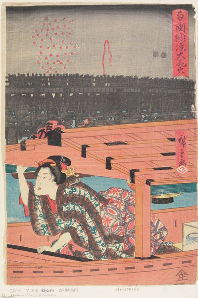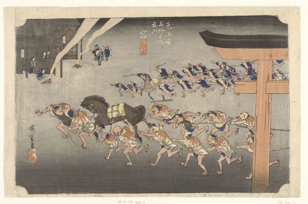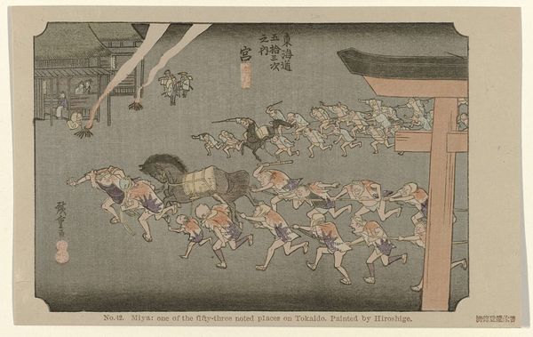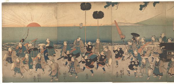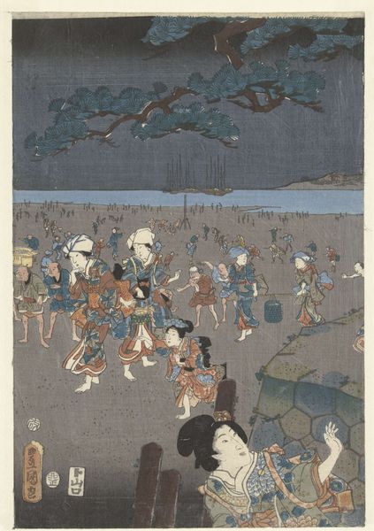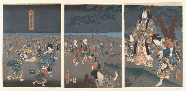 Curator: Well, hello there. What first strikes you about this print? I see a beach bursting with folks, a complete jamboree. Editor: It feels chaotic. There's so much movement, yet the muted palette creates a sense of somberness. But tell me, what exactly are we looking at? Curator: This beauty is “Shell Gathering at Akashi Beach,” a woodblock print made around 1855 by Utagawa Kunisada, housed right here at the Rijksmuseum. Isn't it a marvelous scene? Like a glimpse into everyday life. Editor: It's interesting how Kunisada depicts labor as leisure. But I'm also thinking about what 'shell gathering' might symbolize beyond a simple day at the beach. Was it perhaps a practice only afforded to some and not others, for example? Who benefits from representing shell gathering? Curator: Oh, I like how you’re thinking! The joy is undeniable, and that sky, it feels limitless. Though, with all this hustle and bustle, I do wonder what treasures they hope to unearth—what hidden meanings they carry, you know? Editor: Precisely. It's impossible not to consider these beachgoers in the broader context of socio-economic dynamics. The dark blue of the sky in contrast to all of the figures gathering could also be an exploration of tensions between human endeavors and the natural world. The abundance represented is carefully framed. Curator: Oh, exactly! Frames within frames. So very self-aware and present to me! Like they want to have fun but realize they're stuck on a treadmill toward doom. Editor: Well, perhaps! Thinking about the print as narrative, how might it inform our present moment of mass labor? Curator: All in all, this woodblock is more than just a pretty picture, huh? I mean, it gets you thinking—mulling over daily rituals, economic stratification, mortality, the state of things. Editor: It is an entry point—a beautifully constructed snapshot inviting endless reflection. The contrast in emotions is intense. The everyday and its complexity rendered accessible, challenging us to look deeper, isn't that right?