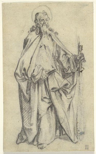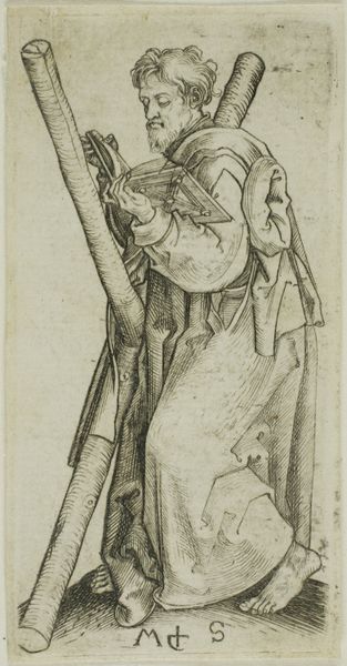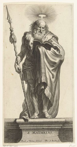 This is Jacques Bellange's etching, Apostel Jakobus Major, created sometime between 1575 and 1616. Bellange, working in the Mannerist style, often imbued his religious and courtly subjects with an air of refinement. Here, we see Saint James, one of Jesus's apostles, but he appears in a rather theatrical, romanticized manner. Look at his flamboyant hat and the elaborate drapery, these details create a sense of drama. This flamboyance can be seen in connection with the artist's position in the court of Lorraine. The emotional weight of the piece resides in this tension: the subject is sacred, yet the treatment veers towards the secular and ornamental. How does this affect our understanding of faith and representation? The traditional narratives of saints are reimagined through the lens of courtly aesthetics and personal expression. This is less about divinity and more about the artist's creative vision.