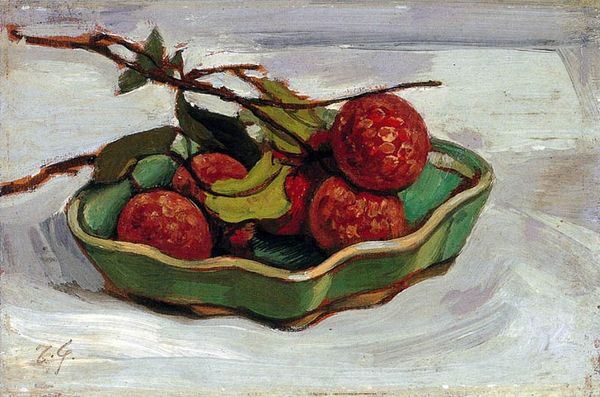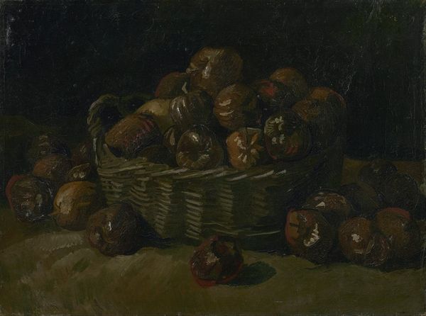 Editor: We are looking at "Basket of Peaches," a still life painting, artist unknown, but I'm getting Henri Fantin-Latour vibes. It's beautifully composed but also a little moody. What do you see in this piece, beyond just fruit? Curator: Immediately striking is the strategic use of light and shadow. Note the tonal range, the deep, resonant browns that form the background, pushing the lighter, more vibrant peaches and grapes forward. How would you describe the composition? Editor: It feels very balanced. The basket is the obvious focal point, centrally located. The peaches are arranged almost pyramidally, drawing my eye upward, which gives some order to what would otherwise just feel like a random arrangement. Curator: Precisely. The structure lends a sense of stability and order, but consider the impasto technique, evident in the application of the oil paint. The rough texture juxtaposes against the smoothness of the fruit. What does that signify? Editor: Perhaps a tension between reality and representation? The brushstrokes remind you that it's paint, not actual fruit. Curator: Yes, but beyond that, it adds depth and dynamism. Observe also the restricted palette: primarily earth tones, punctuated by the reds and yellows of the fruit. It evokes a sense of warmth and ripeness, yes? Editor: Absolutely. It's inviting despite the darker background. Curator: So, it becomes clear that the true subject here isn't the peaches themselves, but the artist’s exploration of form, color, and texture, carefully balanced within the two-dimensional picture plane. A compelling tension is created by the dark atmosphere against a seemingly delightful dish. Editor: That's a wonderful way of putting it. I see the structural harmony more clearly now.