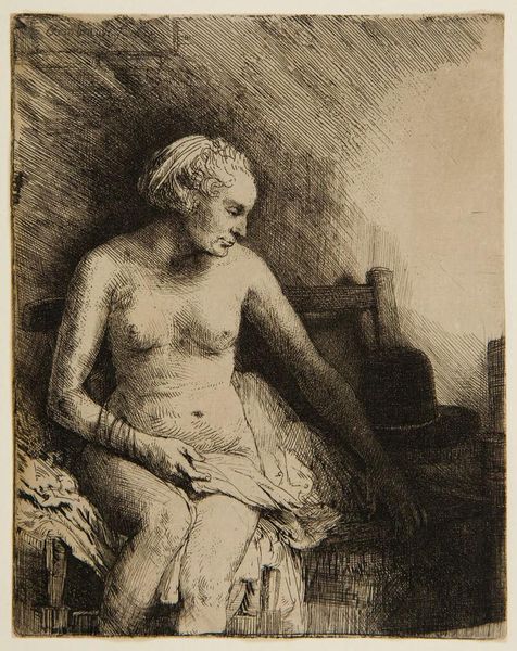 Rembrandt van Rijn etched this print of a woman at her bath, with a hat beside her. The bather is caught in a moment of private reflection. Her gaze is directed downwards in a pose that evokes the classical Venus, a timeless symbol of beauty and purity. The intimate act of bathing has carried symbolic weight through history, often associated with purification. Consider the ancient Roman bathhouses, places of ritual cleansing. Rembrandt knew his classics, and we can trace the echoes of antiquity in his Dutch interior. The hat, a modern addition, contrasts with the classical allusion, adding a layer of complexity. The emotional intensity of the image engages us on a subconscious level, tapping into our collective memory. This is not just a scene of personal hygiene, but a timeless symbol of renewal, continually resurfacing and evolving, echoing through art history, and taking on new meanings.