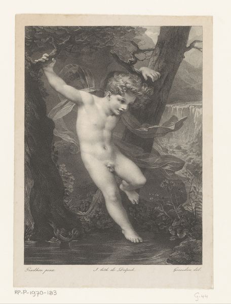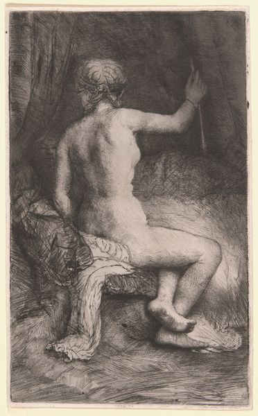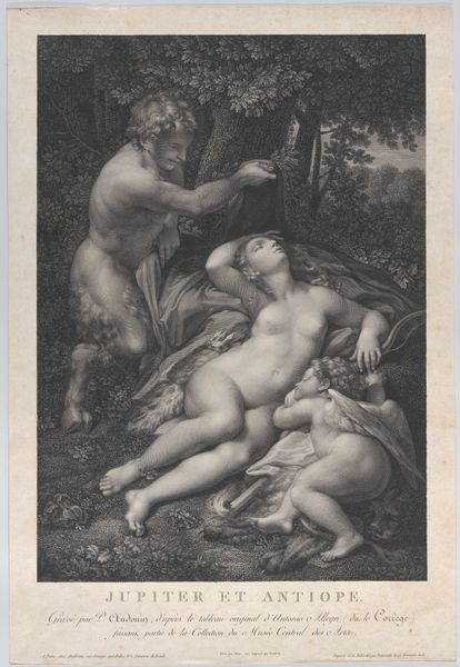 Editor: This is "Jupiter en Io", an engraving made between 1529 and 1743, currently at the Rijksmuseum. The nude figure and the dark tones give it an almost dreamlike quality, and it looks like some charcoal or maybe chalk was used to give definition. How do you interpret this work, focusing on its materials and methods? Curator: Look closely at the process of engraving itself. It is not merely a reproductive technique, but a means of production that imposes a specific visual language. Think about the labor involved—the careful etching, the inking, the printing. The eroticism is, in some ways, manufactured by the very act of reproduction for a consumer base. Do you consider this 'art' or another form of manufacturing? Editor: I see what you mean about the manufacturing process imposing its own character. It’s interesting how the theme of eroticism, even back then, could be tied to consumerism and mass production. What do you think the choice of engraving as a medium says about its accessibility, given paintings would only be seen by a few? Curator: Precisely. Engraving made such images widely accessible, turning "high art" subjects into commodities. Consider the societal impact of distributing previously exclusive content – transforming artistic expression into items for the masses. Think about the power dynamics: whose labor produced this, for whose consumption, and to what end? How might those relations be contributing to it now? Editor: It definitely gives me a new perspective. Focusing on the engraving process really opens up a discussion about the art market itself and who controlled it, especially concerning accessibility to broader audiences through printed copies. It certainly shifts my initial view. Curator: Indeed. Examining the materiality of the piece prompts us to consider it as more than just a static artwork but a cultural product embedded in historical labor practices and consumption patterns.