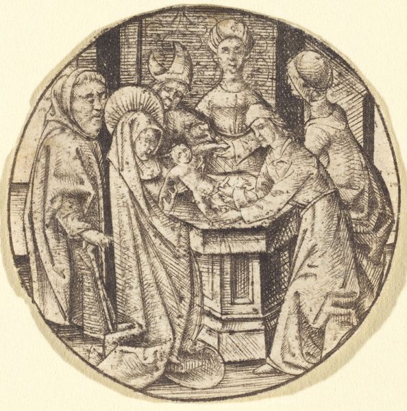 Editor: This is "Episode from the 'Gesta Romanorum': The Emperor and the Page," a pen and ink drawing by Jörg Breu the Elder, made sometime between 1500 and 1537. The detail is really striking, especially given how small the figures are. How do you read this piece, with its busy composition and focus on storytelling? Curator: The composition certainly is packed! Note how Breu uses the circle—the tondo—to focus our eye. It becomes a sort of symbolic lens through which we view the emperor's power. Do you see how the figures are arranged almost theatrically? Editor: Yes, like a stage! The emperor is at the center, but everyone around him seems to be caught in their own little drama. Curator: Exactly. It echoes the *Gesta Romanorum*, a collection of moral tales popular then. Each character plays a role in a didactic lesson, with the Emperor embodying power, but what kind? Think about the objects--the crown, the vessels. What do they symbolize in relation to the Emperor? Editor: Wealth, authority, certainly… But looking at his expression, I also see concern. Maybe power comes with a burden. Curator: A very astute observation. His attire reflects his status, but his face suggests the weight of it. Perhaps this is Breu's way of commenting on the human condition through the lens of Imperial power and morality, mirroring common Late Medieval morality plays. What remains timeless in this symbolism, you think? Editor: It is about responsibilities of power. Seeing it presented this way makes me reflect on how we still grapple with the implications of authority today. Curator: Precisely. And the visual symbols act as cultural echoes, constantly reinterpreted through time. It highlights the continued relevance of narrative and art.