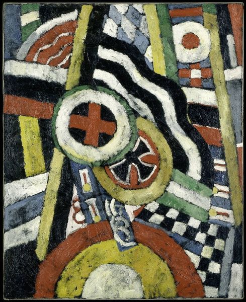 Editor: This is Marsden Hartley’s "Portrait of a German Officer," painted in 1914. The painting, oil on canvas, strikes me as both chaotic and controlled, like a military uniform deconstructed into geometric forms and vibrant colors. What's your perspective on this seemingly abstract portrait? Curator: Looking through a materialist lens, I see a critical commentary on the industrialization of warfare. Consider the fractured, geometric forms; they echo the machine age and the fragmentation of identity within the military system. What do you think Hartley is trying to convey by reducing the officer to these almost symbolic, manufactured components? Editor: So you see the abstraction as a representation of the mechanization of war? It's like the officer is being processed, turned into a cog in the machine. Curator: Exactly! Notice the prevalence of symbols – the Iron Cross, flags – all flattened and depersonalized. This removes the romance from war. Furthermore, the materiality of the oil paint, applied thickly and boldly, emphasizes the physicality and labor involved in the act of creation itself. Hartley is making something; is he also unmaking the myths around war? Editor: That’s fascinating. I hadn't considered the physical application of the paint as part of the message. Curator: Consider also that this work was created just before the full horrors of World War I were revealed. The materials—the paint, the canvas—were becoming increasingly scarce as the war consumed resources. What is Hartley implicitly communicating through this lavish, material display in a moment of impending scarcity? Editor: It’s like he’s flaunting the materials while simultaneously critiquing what that kind of consumption leads to. The war machine consumes resources, people… and identities. Curator: Precisely. This artwork forces us to confront the materials and means by which both art and war are produced, laying bare the complex relationship between creation, destruction, and consumption. Editor: I see that so clearly now. Thanks for shedding light on how materials and historical context contribute to the painting’s critical message. Curator: And you've highlighted how form and material are powerful conveyors of social commentary, which enhances the materiality as the centre of this analysis.
