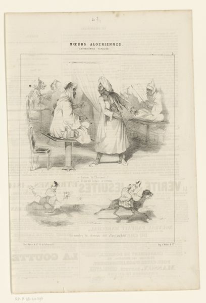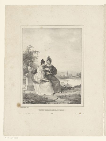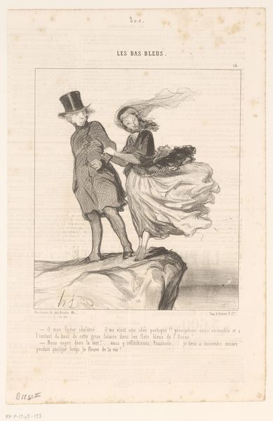 This print by Paul Gavarni presents a man and a woman by the water's edge, both preoccupied with consuming nuts. The act of eating, especially together, has ancient roots as a symbol of communion and shared experience. Consider the shared meal in the Last Supper, or the ritualistic consumption of food in various religious ceremonies. Here, however, the mundane act of eating nuts takes on a different tone. It lacks the spiritual weight of those earlier depictions, yet the underlying theme of shared sustenance remains. The woman, head bowed and hands engaged, embodies a certain vulnerability, a posture reminiscent of figures in mourning or deep contemplation. Over time, such gestures evolve, shedding their overt religious connotations but retaining a connection to the human psyche. We see echoes of these postures in modern depictions of grief or introspection. Gavarni captures a fleeting moment, transforming a simple act into a tableau of human interaction and emotion, reminding us that even the smallest details of our daily lives are laden with history and meaning.