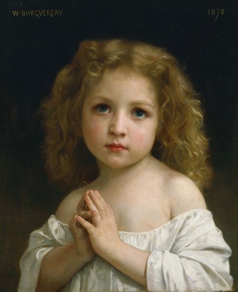 Curator: William Bouguereau’s 1878 oil painting, “Joueur de flûte," or "The Flute Player," is before us. Editor: My first impression? It’s almost unsettlingly perfect. That level of idealized realism…it makes the child seem less like a real boy and more like an exquisitely crafted doll. Curator: That smoothness is deliberate. Bouguereau aimed for an elevated form of beauty. Notice the details in the child’s hair and eyes – symbols of innocence and promise. The flute itself alludes to pastoral simplicity, harkening back to classical ideals. Editor: But those classical ideals are constructed, aren't they? Look at the boy’s clothing. It is carefully arranged, but looks as though he might be forced to participate, despite this instrument meant for merriment and revelry. How much labor went into achieving this impression of carefree beauty? What about the sourcing and mixing of paints, and who prepared the canvas for an artist of this prominence? Curator: Certainly. The artist operated within a very specific socioeconomic structure. The flute also has long-standing associations with mythological figures like Pan, god of the wild, representative of unrestrained sensuality. Perhaps this adds to the painting’s inherent tension. The artist is attempting to make a god in the common street. Editor: That contrast interests me most. This is clearly high art, but genre painting suggests that he encountered this figure of the flute player on the street. It would be fascinating to learn about Bouguereau’s creative process – what kind of preparation, and planning, might it have required to represent the commoner and common activity within the traditional frame? Curator: Indeed. Bouguereau masterfully balances realistic and symbolic representation in this artwork. The boy seems both universal and particular. The flute becomes both an object and an allegory. Editor: Thinking about how the image of this “common” figure has been transformed and preserved—from the materials to the context—it reveals so much more. I can only ask myself—who decides whose images get elevated to the status of high art, and why?