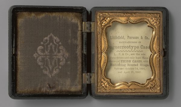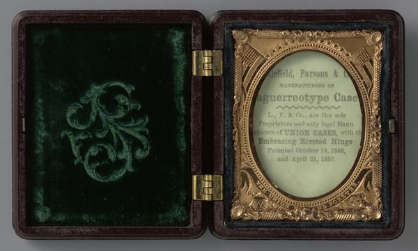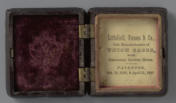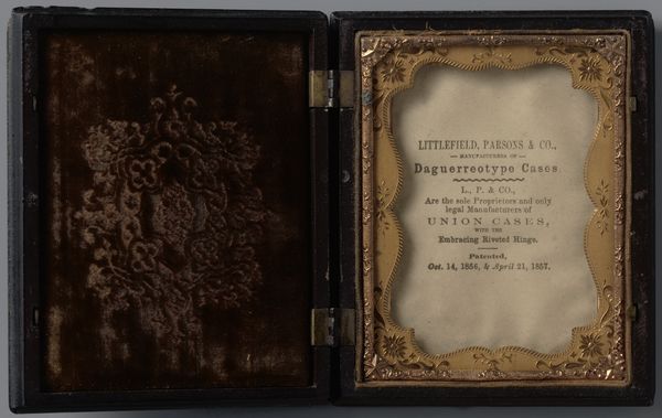 This is a daguerreotype case made by Parsons & Co. Littlefield sometime between 1856 and 1857. These cases were designed to protect daguerreotypes, a popular form of photography in the mid-19th century. What makes this case particularly interesting is the inscription inside, highlighting that Littlefield, Parsons & Co. are the ‘sole proprietors and only legal Manufacturers of UNION CASES, with the Embracing Riveted Hinge.’ This wasn't just about craftsmanship; it was about controlling the market. The daguerreotype was revolutionary, capturing images in a way never before possible, and companies like Littlefield, Parsons & Co. sought to capitalize on this new technology. The language used in the inscription also reveals the importance of patent law and intellectual property in this period. It indicates a desire to establish legitimacy and market dominance in the burgeoning photography industry. By examining business records, legal documents, and advertisements, we can uncover more about the market forces that shaped not only the production of these cases but also the dissemination and consumption of photography itself.