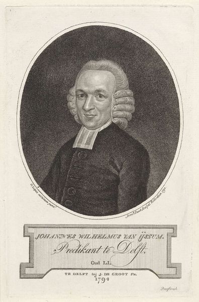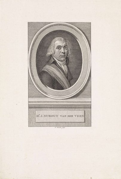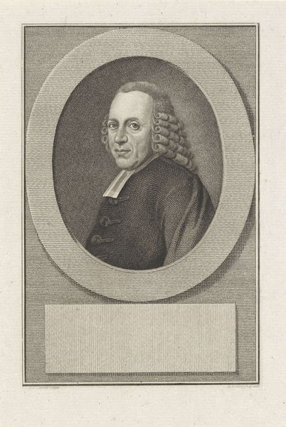 Editor: This is "Portret van professor Adriaan Kluit," an engraving made sometime between 1787 and 1828, attributed to Ludwig Gottlieb Portman, now hanging in the Rijksmuseum. The tight, symmetrical composition is quite striking; it gives the portrait a very formal feel. How do you interpret the piece from a purely visual perspective? Curator: Precisely, it’s a structured engagement. The framing device immediately establishes order—an oval within a rectangle, a deliberate containment of the subject. Consider the texture achieved through the engraving technique; the varying densities of lines create both form and light. What do you observe about the light’s fall? Editor: I see that the light is focused mainly on the face, particularly the forehead, drawing my attention there first. Then, it casts deep shadows under his wig and along the sides of his face. It gives him a stern look, but I am interested to know, does that contrast of light do something to his position in the piece? Curator: It is structuring the composition: It is a strategic deployment that adds volume and definition. Observe how the starkness is somewhat softened by the curvature and fine detail of the wig. It introduces dynamism within this rigorous format. How might you consider the visual effect of the clothing? Editor: The clothing is plain, almost blending into the darker background. I’m guessing it helps to put the spotlight on the face, so the eye isn't distracted. This is how Portman can direct you where he wants you to focus, but also give this professor prominence by directing light on his forehead. Curator: Correct. And the clean lines reinforce the portrait's intellectual nature and avoid opulent distraction, as neoclassicism shuns flamboyance. Thinking structurally, this ensures the composition supports, rather than detracts, from the work's meaning. Editor: That makes so much sense; focusing on the lines and structures lets you dig into its meaning without all the noise of historical context, which makes it approachable and interesting. Curator: A useful and revealing practice in all your visual examinations.