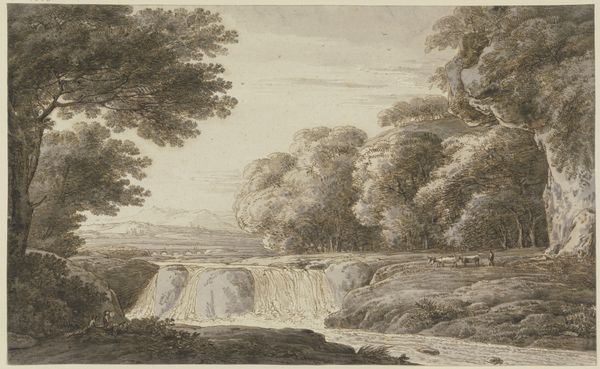 Editor: Here we have Jan Wils's "Landscape with a River," executed in ink. The scene feels both serene and meticulously constructed. What compositional elements strike you most powerfully? Curator: The carefully calibrated interplay of light and shadow. Note how the artist uses the sepia ink to create a subtle yet effective chiaroscuro, guiding the eye through the various planes of the composition. Observe how the density of the ink defines form and space, particularly in rendering the textures of foliage and rock. Editor: So, the monochromatic palette emphasizes form and texture above all else? Curator: Precisely. The absence of color directs our attention to the modulation of tone, the skillful hatching and cross-hatching that create a rich tapestry of light and dark. It is a masterful exercise in economy of means. What is the effect of the horizon line being where it is? Editor: Interesting question! The horizon is pretty high, and so it gives more emphasis to the immediate foreground…it does add to the sense of intimacy in this small scene. Curator: And does that limited vista enhance the overall effect of introspection and containment, directing the viewer's focus inward toward the intricacies of the artist's technique and compositional choices? Editor: Yes, I think it does. Focusing on those contrasts helps create this intimate view. Curator: This piece underscores how an artist's manipulation of basic elements—line, tone, and composition—can create an aesthetic experience of profound complexity, all while using what seems to be a simple ink wash technique. Editor: That's such a valuable insight. Seeing the drawing now, it’s as though the limited palette is less of a restriction and more of a focused statement.