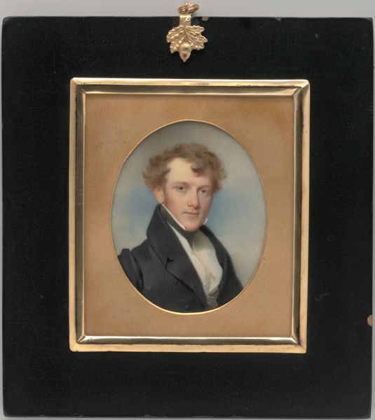 Editor: So, this is "Portrait of a Gentleman," painted by Carl Weinedel in 1836. It's an oil-on-panel miniature. What immediately grabs me is the ornate gold frame; it feels as important as the portrait itself. What's your take on it? Curator: The miniature format itself speaks volumes about material access and class. This wasn't mass-produced; it's an individualized commodity, requiring skilled labor in both the painting and the crafting of that decorative gold frame you mentioned. Consider the gold, its sourcing, the artisans involved. Editor: Right, it's definitely not a photograph readily available to just anyone. Did the frame have significance beyond being decorative? Curator: Absolutely. The frame transforms the image into something precious, almost jewelry-like. Think about who had access to gold in 1836, and the labor involved in its extraction and fabrication. This wasn't just about capturing a likeness; it was about displaying wealth and status, made possible through very specific social relations of production. What does the sitter's clothing communicate in this context? Editor: He looks to be wearing formal attire, a dark coat, maybe silk or velvet, a pristine white shirt with a cravat, again signifying someone from the upper class. So the painting is both image and object, communicating the same message? Curator: Exactly. The materials and means of production aren’t neutral. They are deeply embedded in economic and social hierarchies, reflecting power relations inherent in 19th century society. Editor: So I was viewing this piece too superficially, focusing only on its aesthetic quality, whereas its physical construction is actually crucial to its understanding. Curator: Precisely! Materiality reveals hidden stories about labor and social power.