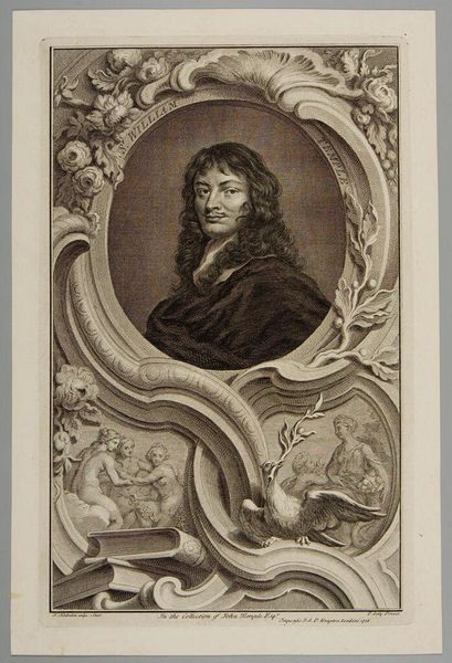 Editor: Here we have Jacob Houbraken’s "Portret van William Temple," an engraving from around 1736 to 1738, held at the Rijksmuseum. It's striking how the ornate frame seems to almost compete with the portrait itself. What catches your eye when you look at this print? Curator: The symbolic layering speaks volumes, doesn’t it? Look at the dove with the olive branch, the putti with books, and the floral garland surrounding the central figure. Each element is a carefully chosen emblem. It suggests Temple's connection to peace, learning, and perhaps even a flourishing legacy. Does the symmetry of the frame strike you as a conscious attempt to elevate Temple? Editor: Definitely, it seems like they wanted to immortalize him! Are the cherubs and doves common symbols for this time period? Curator: Absolutely. These aren't just decorative flourishes. Consider the dove; it's a nearly universal symbol of peace, co-opted by various cultures across millennia. In combination with cherubs—messengers of the divine associated with intellect and love—it constructs a specific visual language. What emotions do you think Houbraken intended these symbols to evoke in the viewer? Editor: I think it’s a demonstration of wisdom and knowledge through visual symbols. Now I can appreciate how it might represent the importance of a peaceful legacy. Curator: Precisely. Visual symbols are never arbitrary; they represent layers of accumulated meaning that contribute to the cultural narrative embedded within an image. It's intriguing to consider how these symbols persist and evolve over time, shaping our collective memory.