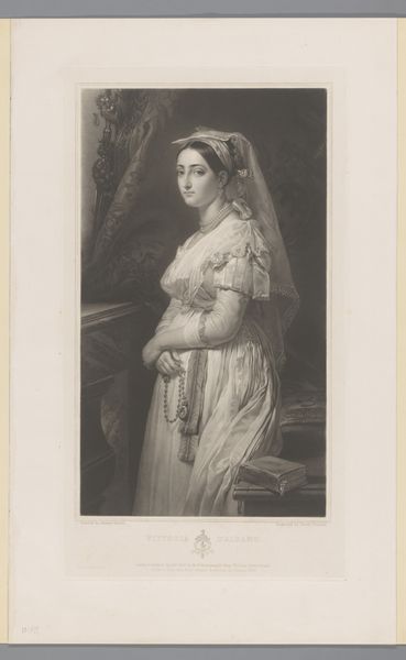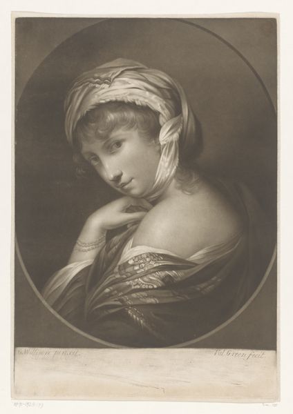James Watson created this print, “Portret van Christiana Collier,” using mezzotint, a process that allows for rich tonal contrasts. The print offers us a glimpse into the visual culture of the late 18th century. During this era, portraiture was not merely about representation; it was deeply intertwined with social status and identity. Christiana Collier's demure posture and the delicate rendering of her features speak to the era’s ideals of femininity: modesty, grace, and beauty were highly valued. Yet, the print also subtly challenges these norms. While it presents Collier within the bounds of societal expectations, there is a hint of individuality in her gaze. This was a period of significant social change, as the Enlightenment ideals began to question traditional hierarchies. How does this portrait reflect or resist these shifting cultural values? It invites us to reflect on the complex negotiations individuals, especially women, navigated in constructing their identities.