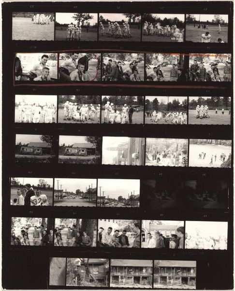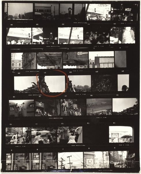 Curator: This is a fascinating contact sheet featuring twelve photographs by Lester Cole, titled “Untitled (twelve photographs: street scenes of Cuban revolutionaries).” Editor: Immediately, there's a raw, documentary feel. Like flipping through someone’s intensely personal scrapbook of a revolution. The grain, the stark black and white... it's all so immediate. Curator: Cole’s eye captures these everyday moments amidst the revolutionary fervor. It almost feels like he's humanizing history. Editor: Absolutely. Look at the way the crowds gather in image number five. It reminds me of images of mass gatherings throughout history, from religious processions to political rallies, all seeking a shared identity. There’s power in those numbers. Curator: What I find interesting is the mix of military might and civilian celebration. Editor: Exactly, the tanks contrasted with the jubilant expressions create a potent visual tension. It's a complicated moment. Curator: It leaves you wondering about the artist's perspective. Were they a participant, or an observer? Editor: These images really do make you contemplate what gets remembered and what gets forgotten in the grand narrative of history.