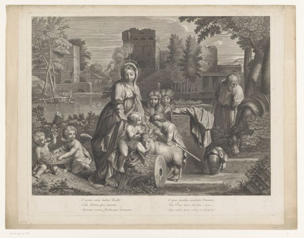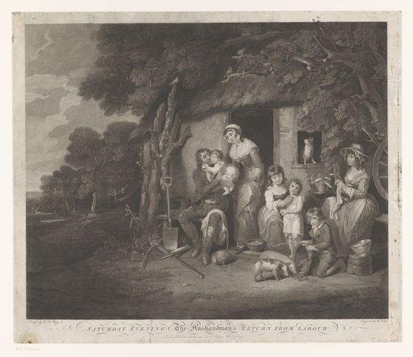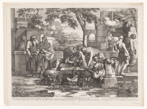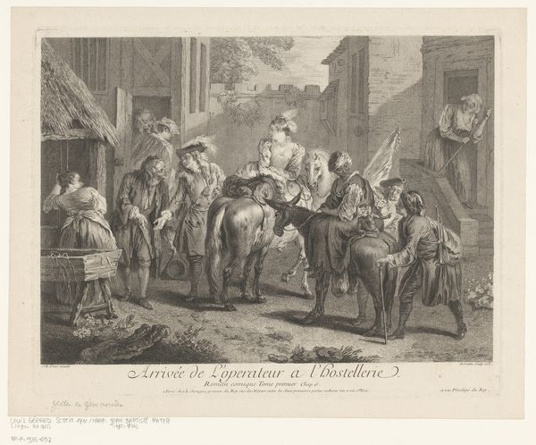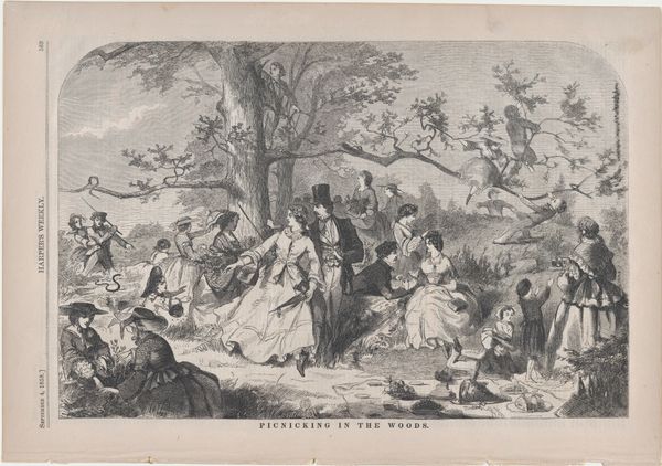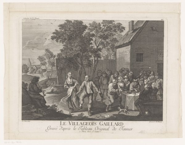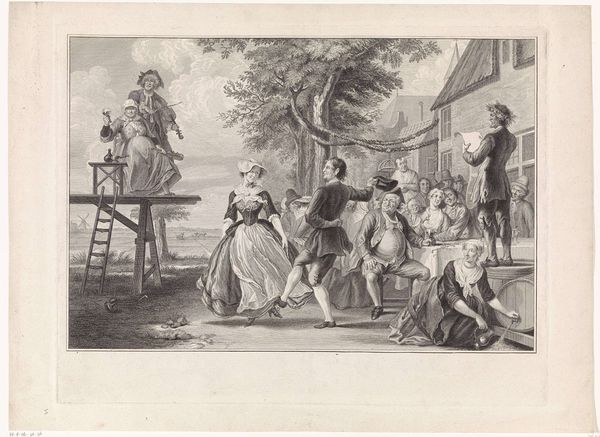 Curator: What strikes me immediately about this image is its composition. It has the feeling of a stage, doesn't it? The dancer is spotlighted in the center, framed by the audience to the left and musicians to the right. Editor: Indeed. What we're viewing is an engraving entitled "Ronggeng dans te Java", dating from after 1856, credited to Carel Christiaan Antony Last. It's currently held here at the Rijksmuseum. I find its portrayal of cultural performance deeply intriguing, specifically how it situates a very local art form within a potentially colonial gaze. Curator: The colonial gaze is definitely a lens through which we can read this. Look at the faces of the onlookers on the left – the distinctly European features standing in stark contrast to the local inhabitants. The artist seems concerned with the act of witnessing itself. Do they understand what's happening before them, or is it merely exotic spectacle? Editor: The positioning of the musicians, with their traditional instruments, feels deliberately ethnographic. The artist positions them almost like specimens, cataloging aspects of Javanese culture. I am interested in what this reveals about power dynamics between observer and observed at the time. What kind of role is the Western gaze having on this image? Curator: Precisely! We must consider the significance of the ronggeng tradition itself. Ronggeng is more than just dance; it embodies sensuality, social connection, and ritual. It represents an intersection of entertainment and spiritual practice. Perhaps these foreigners were interpreting a tradition filtered by their own assumptions. Editor: It makes me wonder about the function of art at that moment in history and about Last's possible role in shaping a Dutch idea of "the Other." "Ronggeng dans te Java" can certainly lead us to broader conversations about representation, exoticism, and the cultural politics embedded in 19th-century visual imagery. Curator: Absolutely, there is much to think about in regards to cultural representation and performance. We cannot know the whole story, but we can, and should, analyze the historical context and explore the rich interplay of meanings imbedded in cultural imagery. Editor: A potent image with layers of narrative to unfold, its artistic presentation is only part of a story still unfolding to this day.